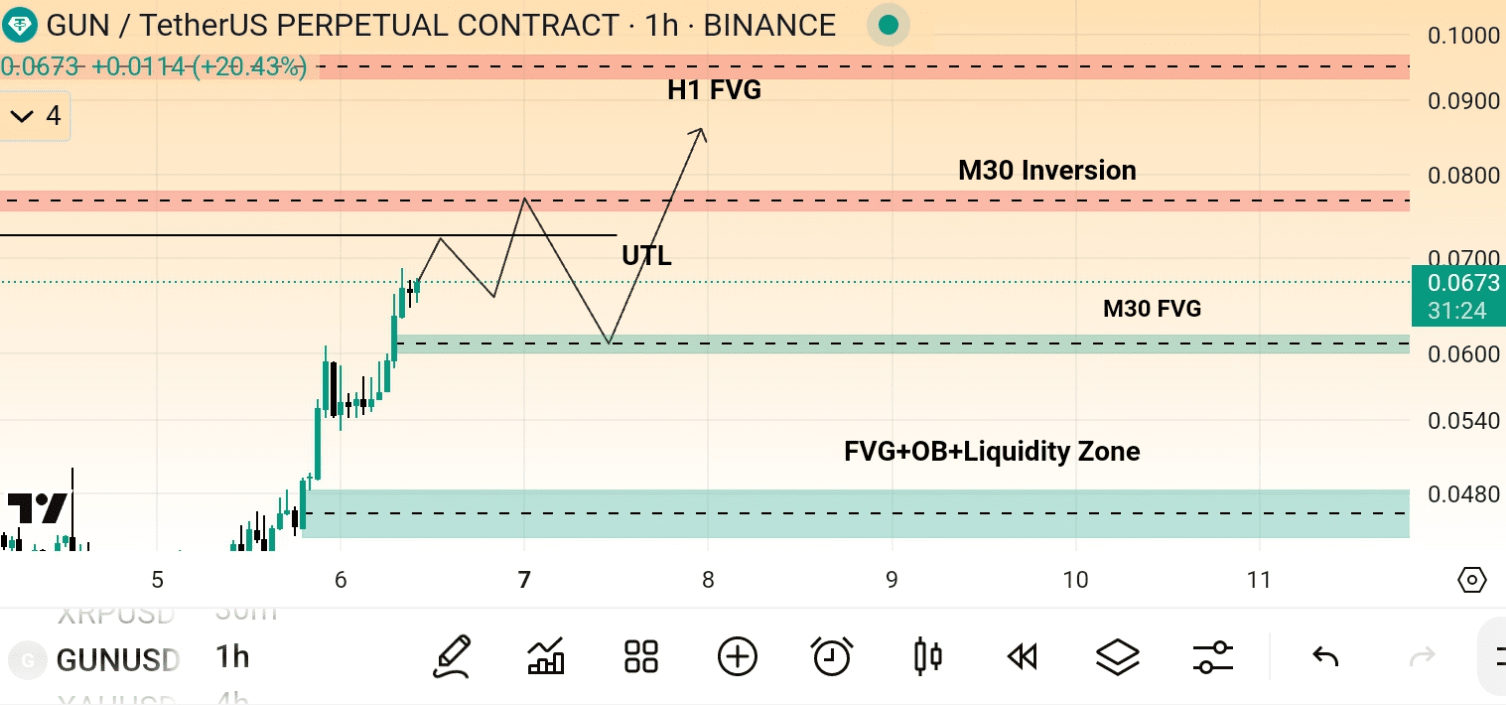 GUN può subire un piccolo ritest dal livello UTL 2-5% e il prezzo romperà, andrà direttamente alla sua inversione M30 in modo che possiamo prendere uno short dal livello di $0.0760 ma senza conferma non lo consiglio per il trading, seguo sempre la conferma VSA. Ok, quindi dall'inversione il prezzo scenderà fino a m30 FVG o Zona di Liquidità quindi compreremo Gun per il Lungo Periodo, significa comprare in spot. E il prezzo sarà rialzista perché stanno rompendo tutti i suoi BOS.