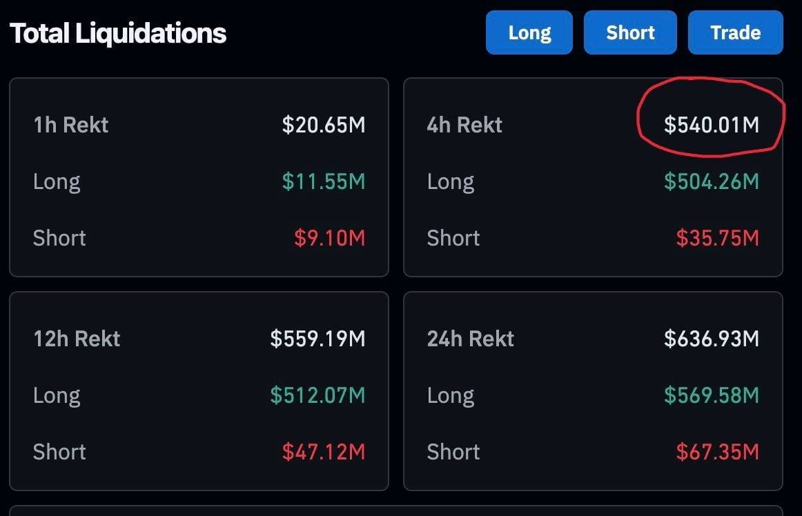 Negli ultimi 4 ore, il totale delle liquidazioni ha raggiunto $540 milioni.