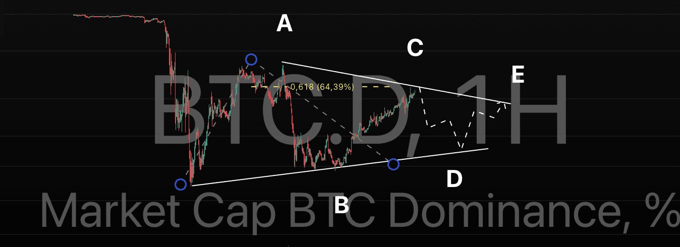 Nel grafico settimanale di BTC.D si osserva un classico triangolo orizzontale (ABCDE), che, con alta probabilità, forma una struttura correttiva nell'onda C