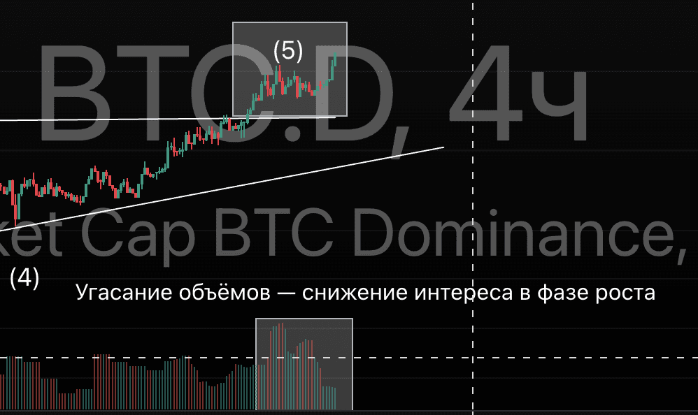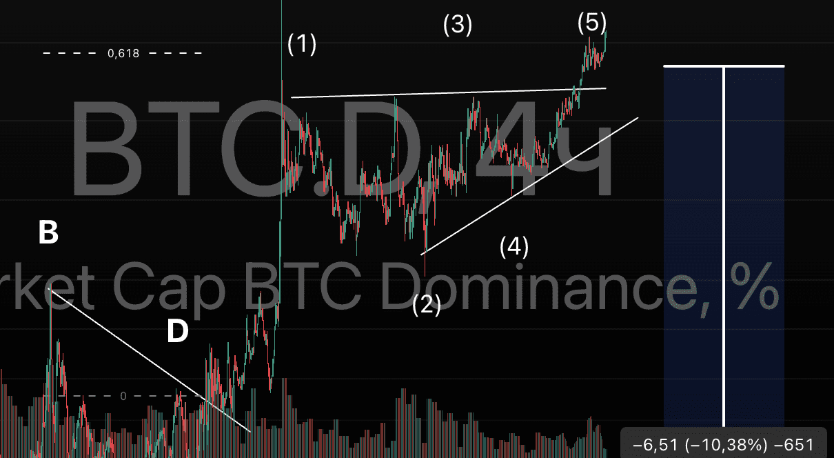 Le diagonali finali sono formazioni finali, dopo le quali il mercato spesso si inverte bruscamente e impulsivamente. Nel contesto di BTC.D, questo potrebbe significare l'inizio di una fase di crescita degli altcoin.