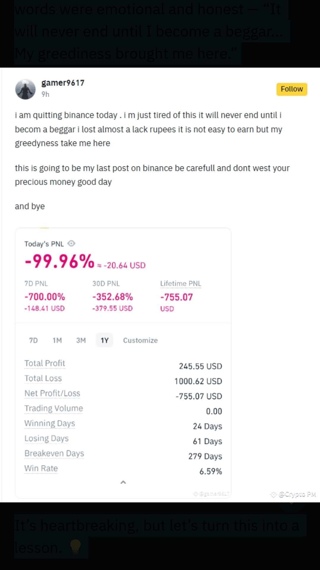 Oggi, un collega trader si è allontanato dai mercati dopo aver perso quasi ₹1 lakh su Binance. Le sue parole erano grezze e reali: