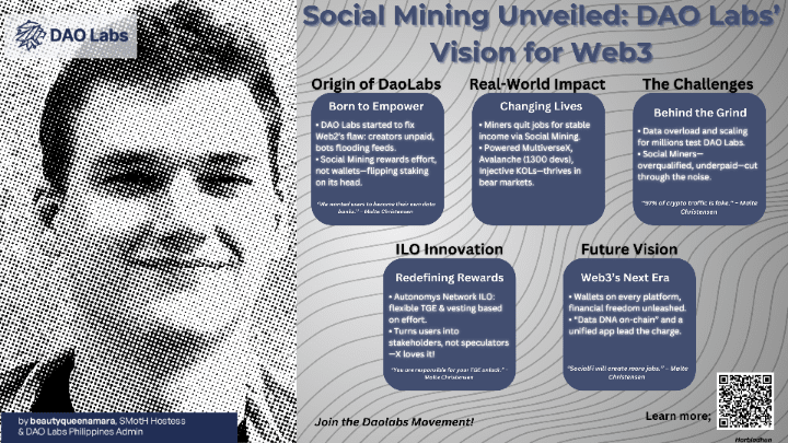 DAO Labs è nato per riparare un sistema rotto: i creatori del Web2 producono valore, ma non ricevono nulla mentre i bot AI intasano i feed. L'antidoto di Christensen? Social Mining—utenti come "bancarelle di dati," premiati per il loro impegno, non per i loro portafogli. È un dito medio alla mentalità del staking "quanto, per quanto tempo".