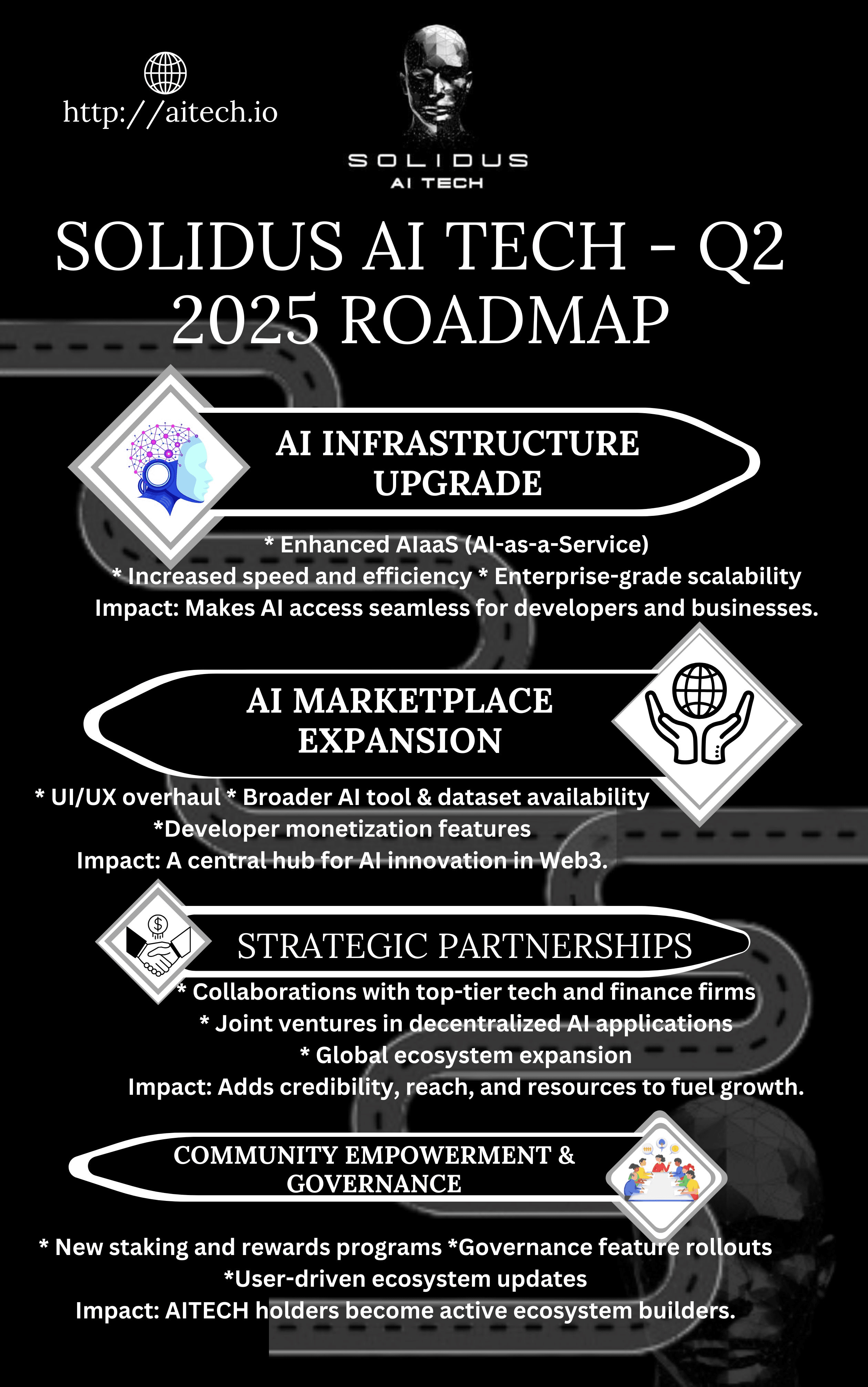 La Roadmap Q2 di Solidus AI Tech segna un passo audace verso il futuro dell'intelligenza artificiale all'interno di un ecosistema decentralizzato. Con un forte focus su scalabilità, velocità e collaborazione, la roadmap rivela un potente mix di innovazione di prodotto ed espansione strategica.