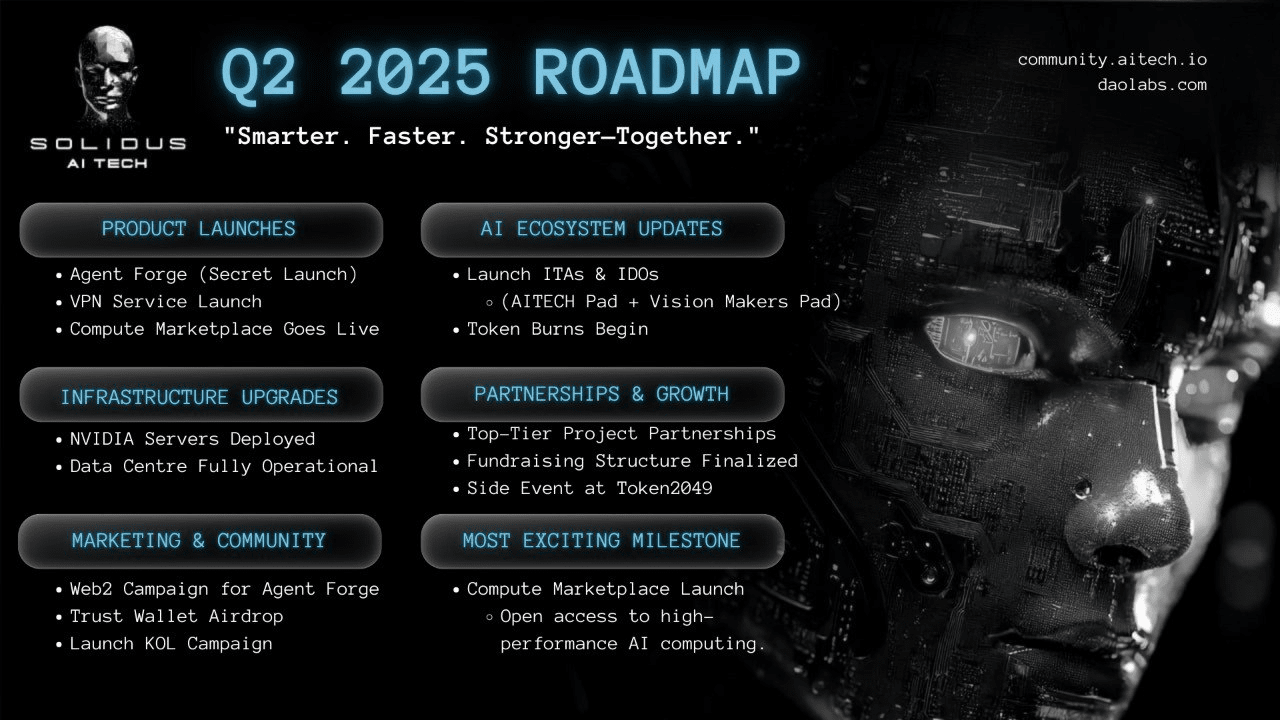 Mentre Solidus@AITECH si proietta nel Q2 2025, la sua roadmap recentemente rilasciata riflette una spinta audace verso una integrazione più profonda dell'IA e innovazione Web3. Basandosi su un Q1 di successo, il prossimo trimestre è ricco di pietre miliari ad alto impatto mirate a scalare l'infrastruttura, espandere l'utilità e promuovere collaborazioni d'élite.