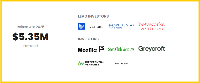 Il round di finanziamento è stato guidato da Variant Fund, White Star Capital e Betaworks, con supporto aggiuntivo da Mozilla Ventures, Seed Club Ventures, Greycroft, Differential Ventures e un gruppo di influenti investitori angel, tra cui Scott Moore, Yasmin Razavi e Thomas Euler.
