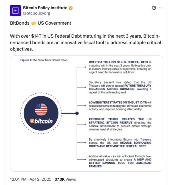 Matthew Sigel di VanEck ha suggerito i "BitBonds" — obbligazioni del Tesoro degli Stati Uniti a 10 anni composte per il 90% da debito regolare e per il 10% da $BTC Bitcoin — per aiutare a rifinanziare $14 trilioni di debito pubblico.