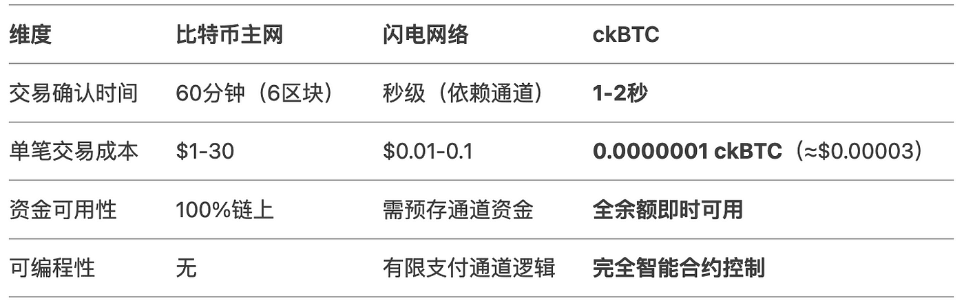 Rispetto alle tradizionali transazioni Bitcoin e alla rete Lightning, ckBTC mostra un vantaggio prestazionale schiacciante: