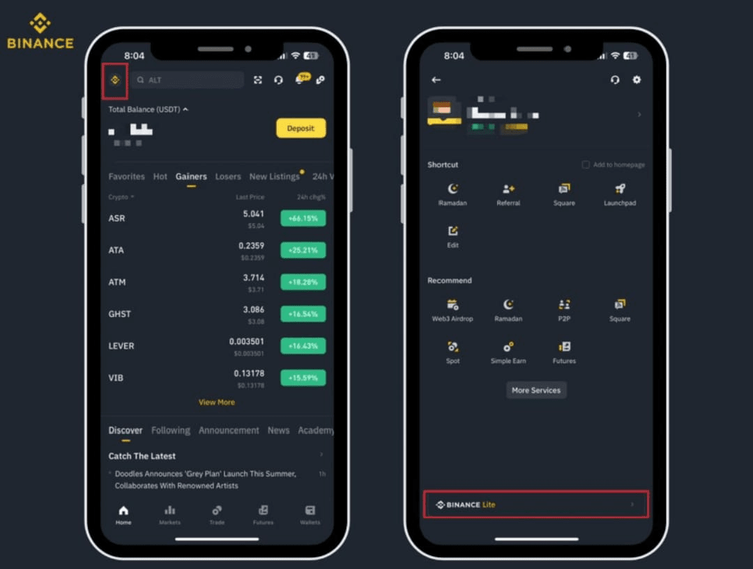 Apri semplicemente la tua app Binance, tocca l'icona del menu in alto a sinistra e passa a Binance Lite — è così facile.