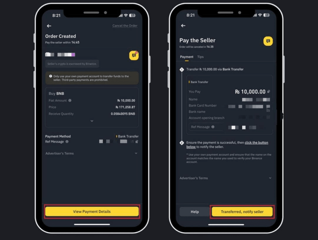 Aspetta che il venditore confermi il pagamento. Una volta verificato, la tua criptovaluta acquistata (ad es., BNB) apparirà nel tuo portafoglio. Veloce, semplice e senza stress!