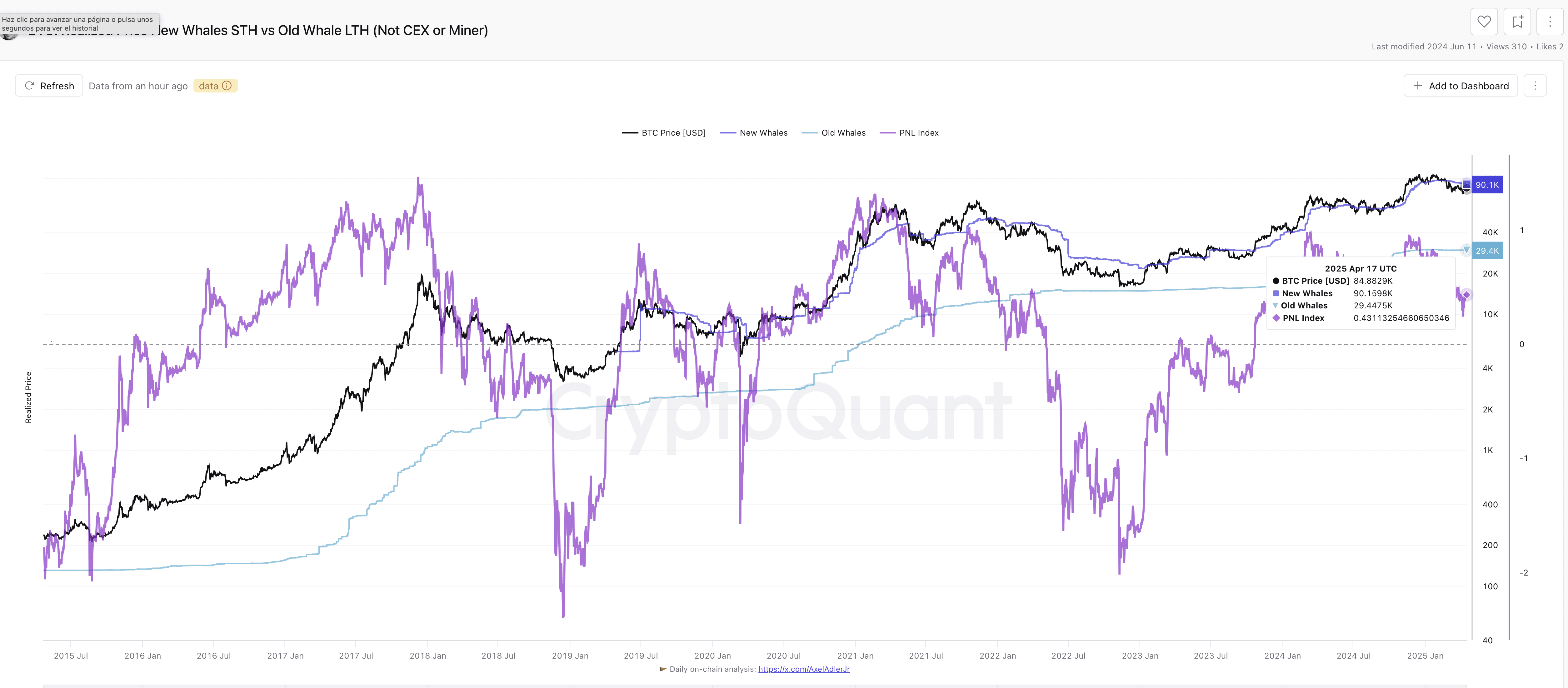 Possiamo vedere Nella metrica ¨BTC: Realized Price New Whales STH vs Old Whale LTH (Not CEX or Miner)¨ si stabilisce un confronto tra i Prezzi Realizzati (medie di acquisto) delle balene STH (-155 giorni di holding BTC) e delle balene LTH (+155 giorni di holding BTC).