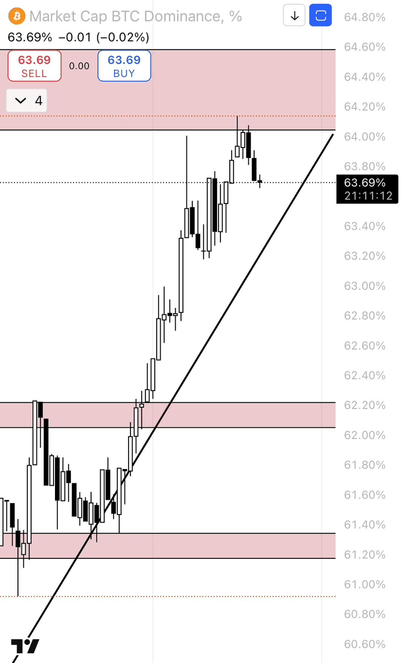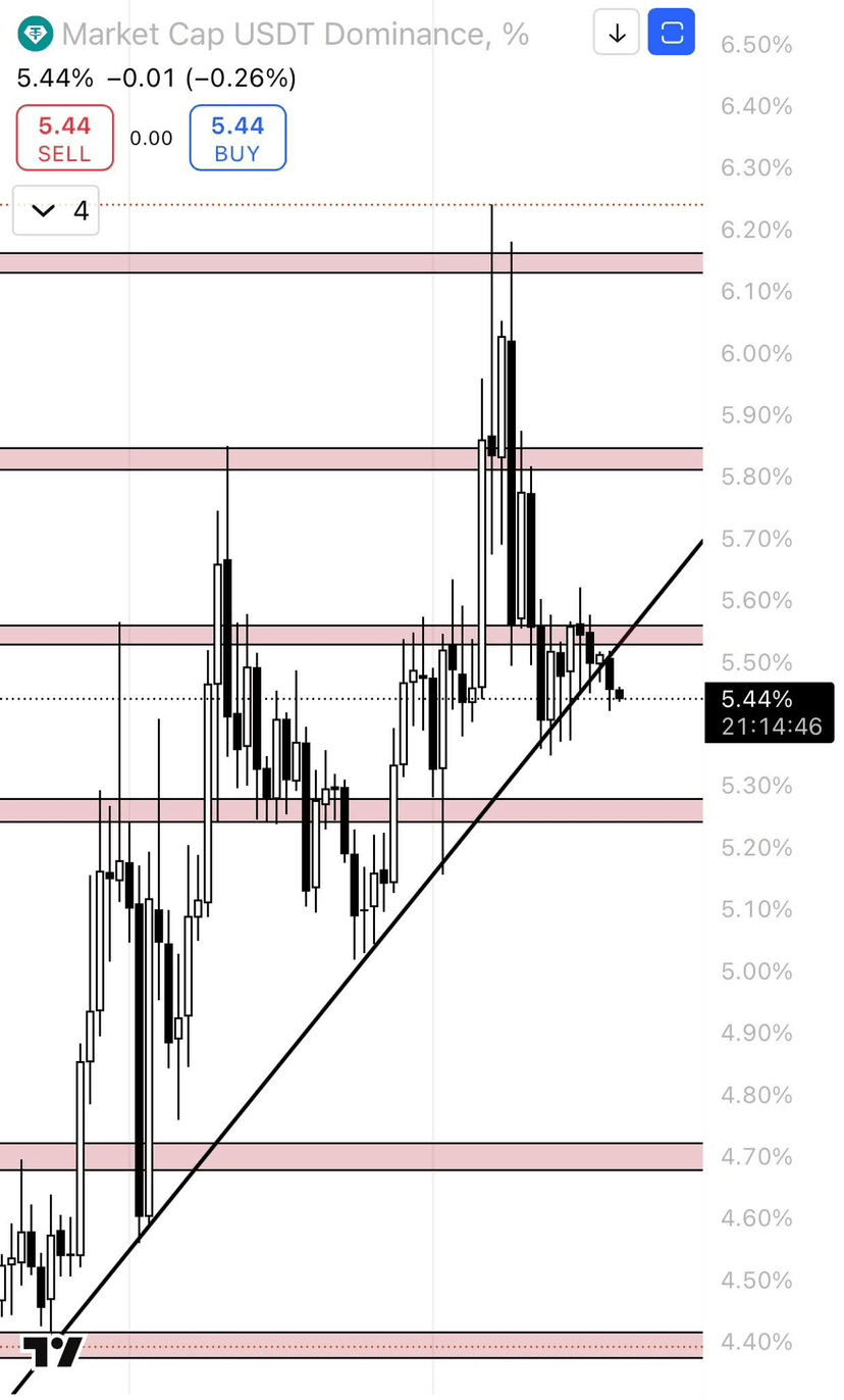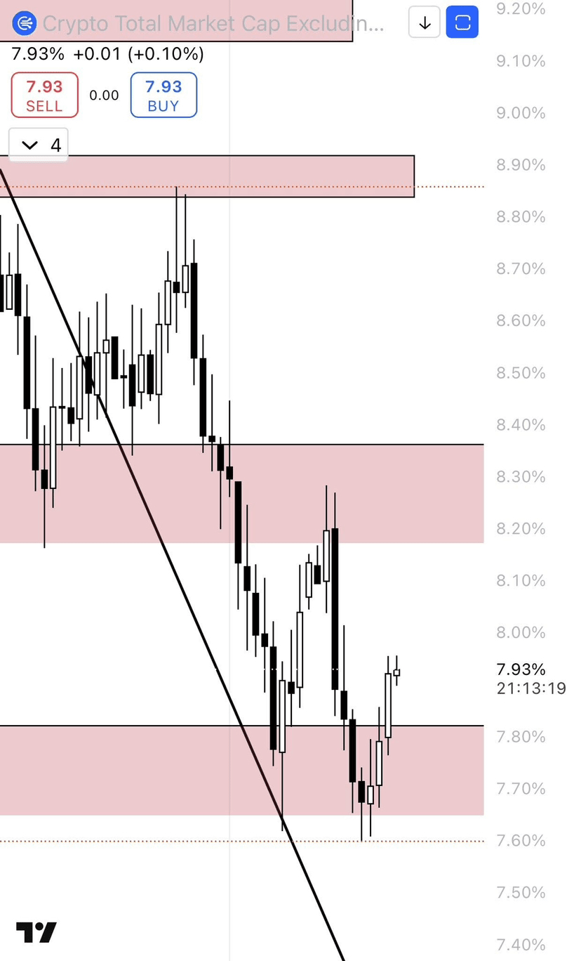 Ma ricorda che per essere rialzisti sugli Alts dobbiamo rompere la resistenza dell'8.26% e creare un HL e poi un HH supportati da volume; fino ad allora non toccare gli Alts a meno che tu non sia felice di correre il rischio prima della conferma.