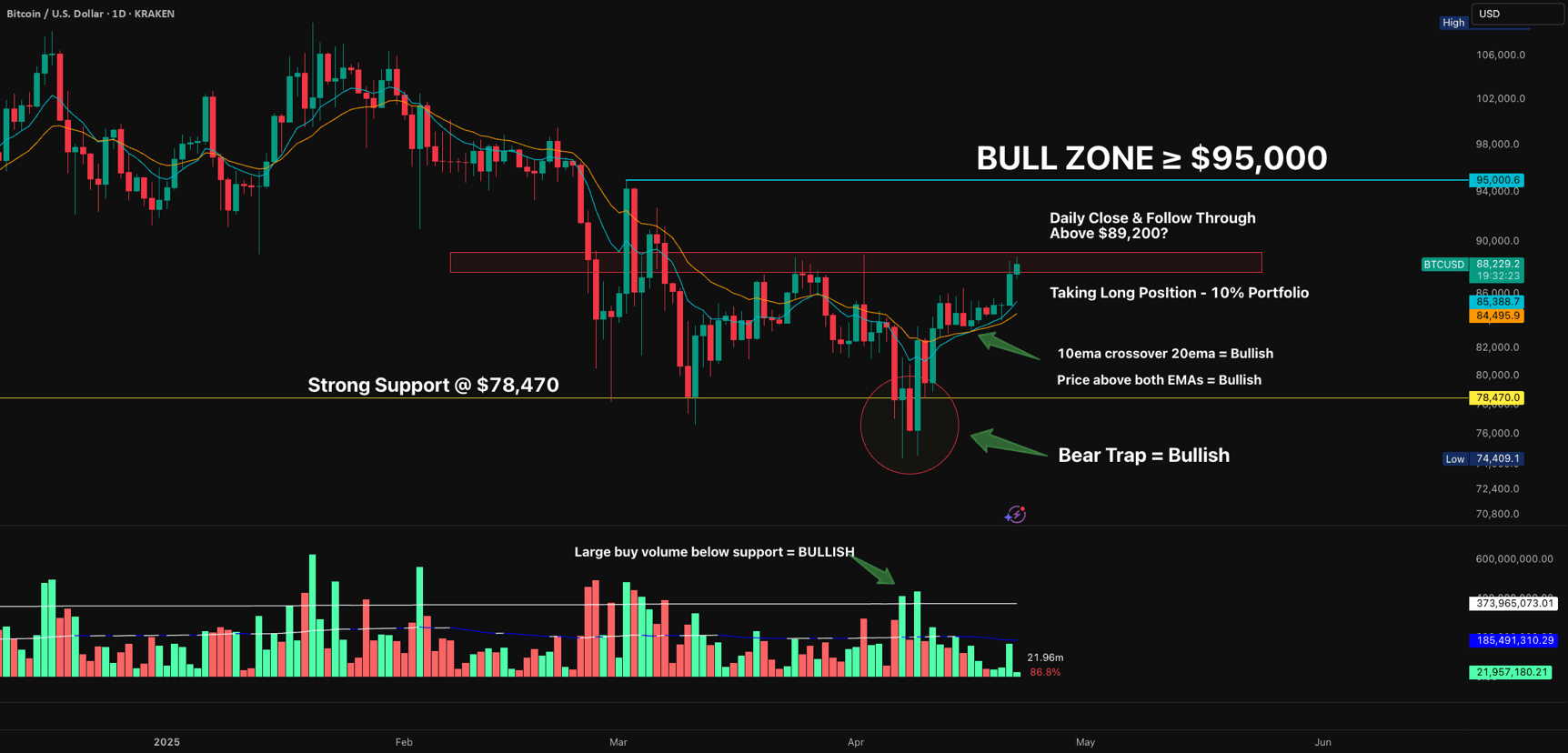 Entro in posizione lunga a qualsiasi prezzo vicino a $89,200 su un timeframe giornaliero.