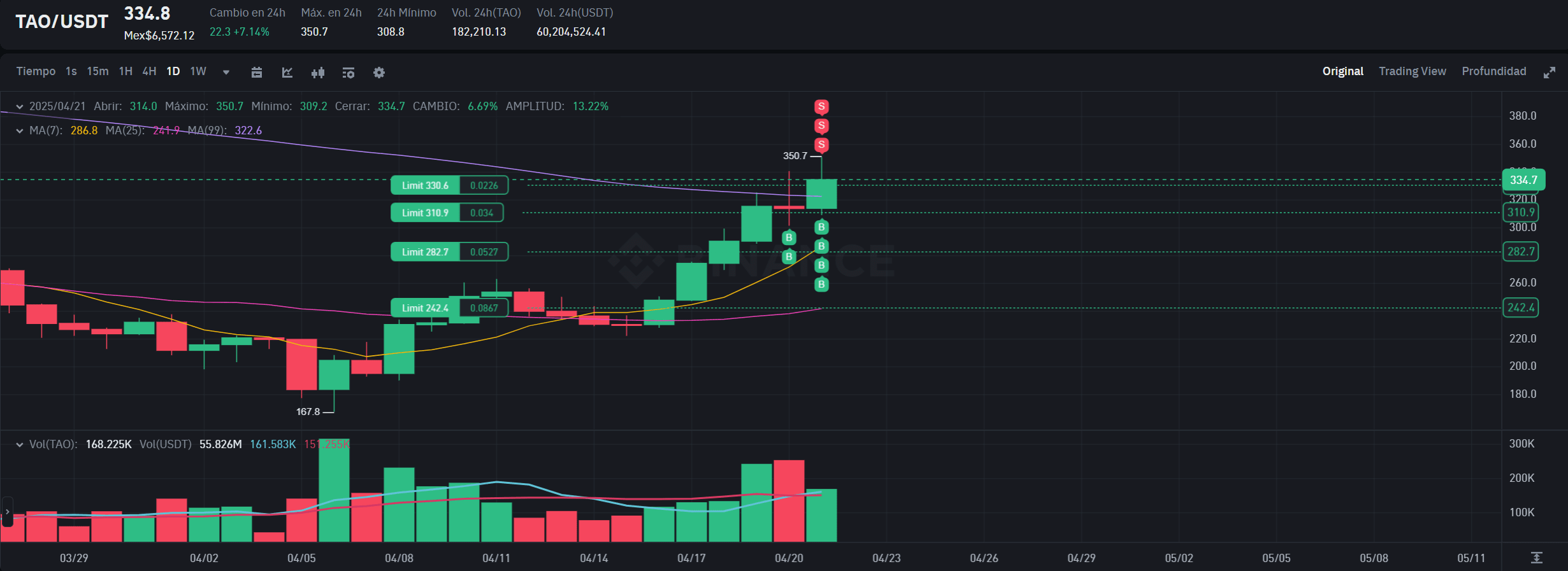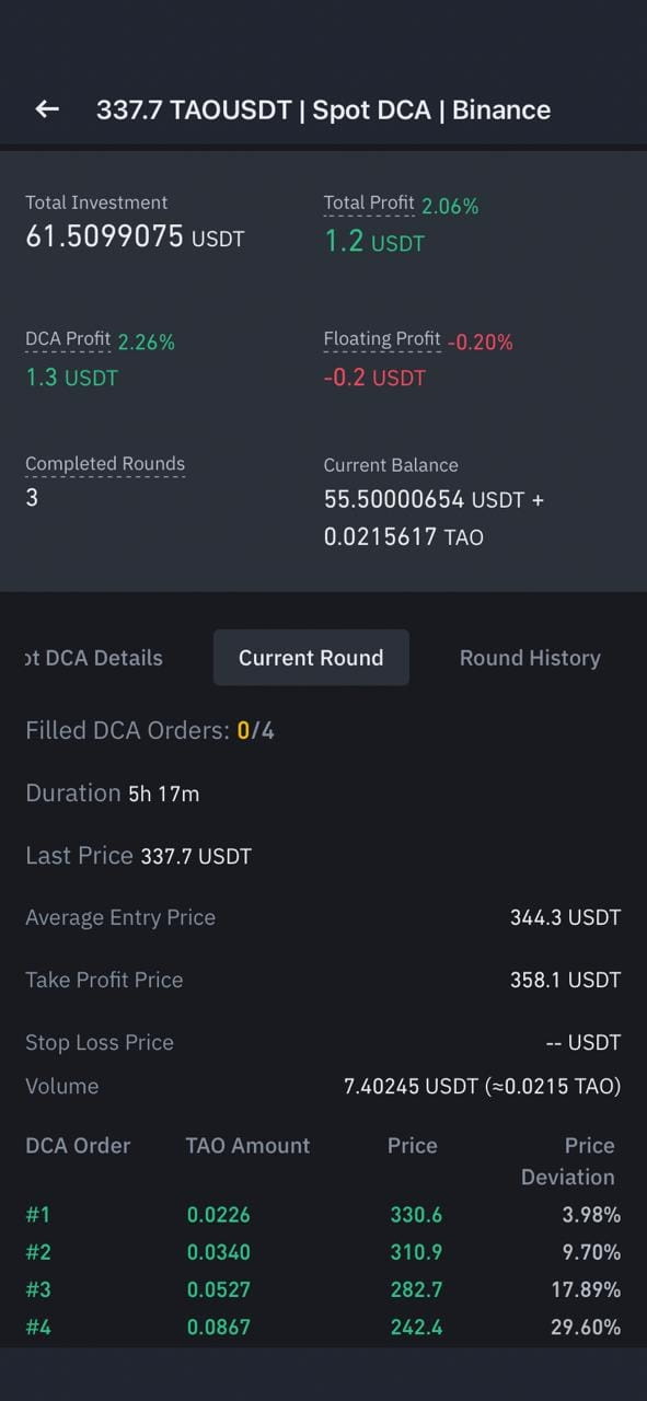 Di conseguenza, l'unica posizione attiva rimane il $TAO TAO/USDT bot Spot DCA lanciato ieri. Finora, ha completato tre cicli di take-profit completi ed ora sta eseguendo il quarto ciclo, senza ordini di acquisto attivati dai nuovi livelli di prezzo regolati.