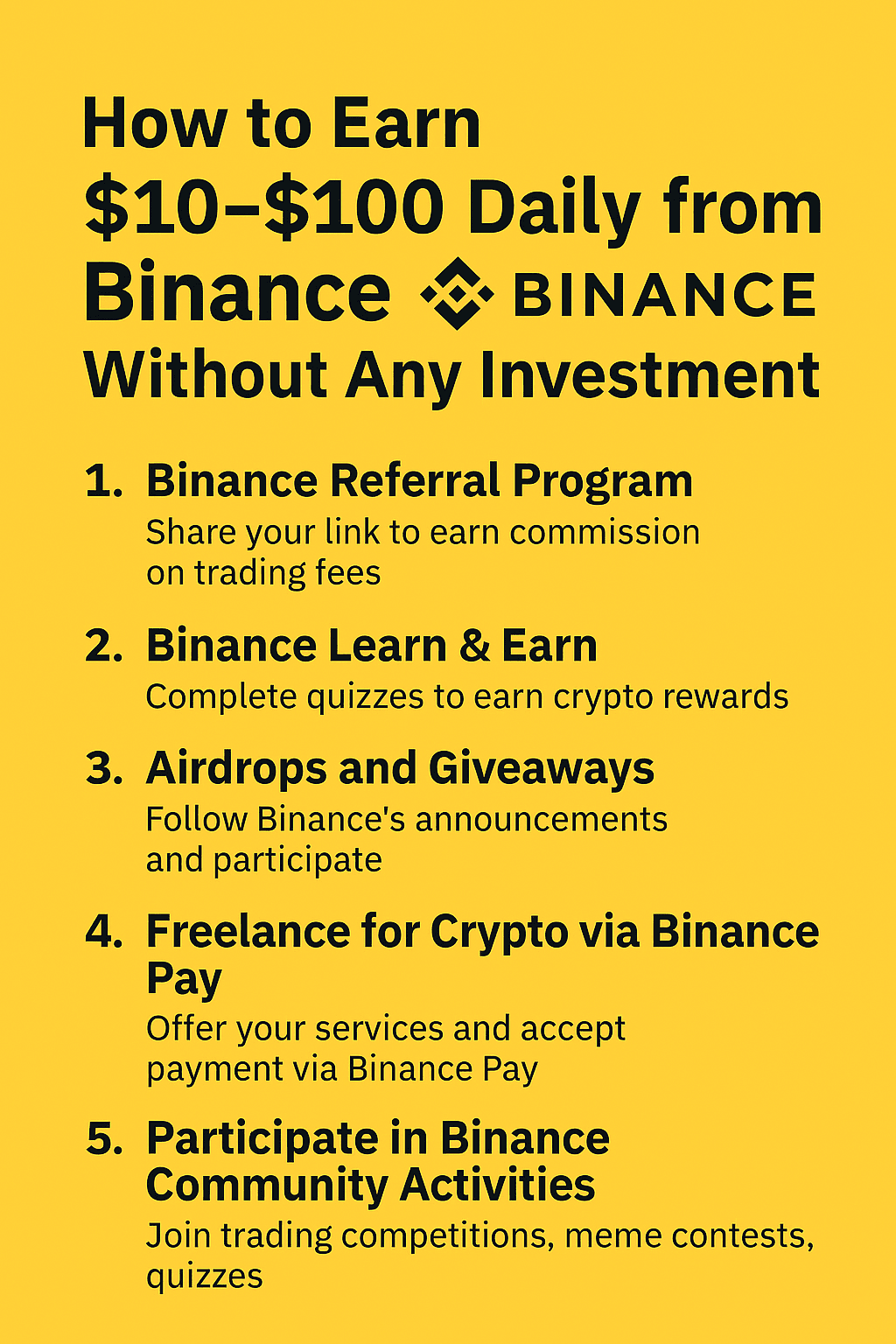 Le criptovalute offrono opportunità entusiasmanti per guadagnare online e Binance, il più grande exchange di criptovalute al mondo, fornisce molteplici modi per guadagnare—anche se non hai alcun capitale iniziale da investire. Sì, è possibile guadagnare da $10 a $100 al giorno senza alcun investimento, semplicemente usando il tuo tempo, le tue abilità e un po' di impegno strategico. Ecco come. #BTCvsMarkets