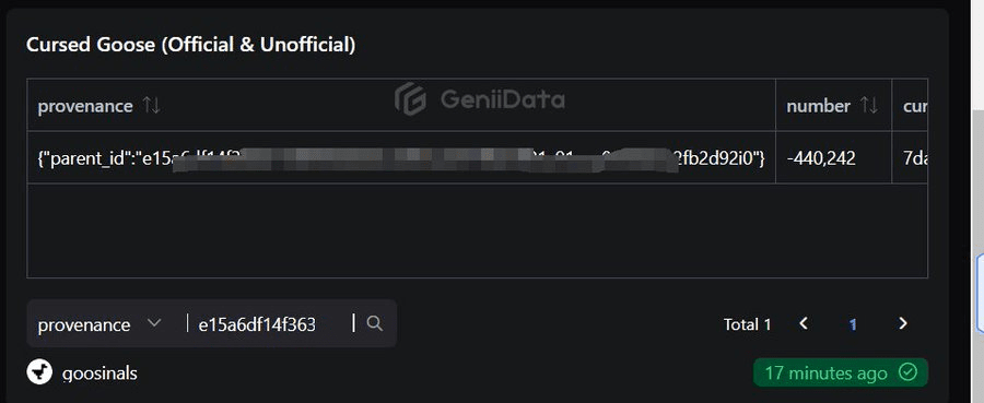 2. Nel pannello gennidata è presente la seguente dichiarazione di non responsabilità "Il conteggio della raccolta ufficiale non mostra correttamente le iscrizioni genitore-figlio. La raccolta sarà completamente indicizzata dopo l'aggiornamento del Giubileo (5-6 gennaio 2024). Fare riferimento al conteggio non ufficiale per l'ultima iscrizione . ", quindi il pannello di destra dovrebbe essere utilizzato per verificare se la tua oca è stata coniata.