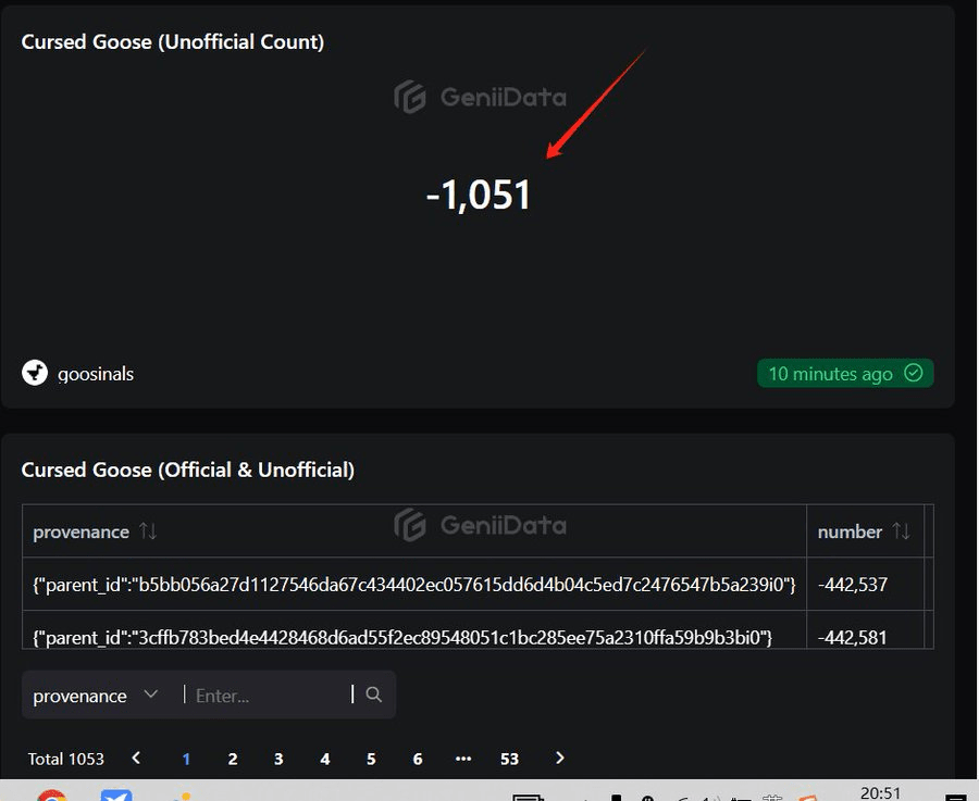 Tuttavia, secondo il panel Gennidata (https://geniidata.com/user/goosinals/cursed-goosinals), finora sono state generate solo 1.051 iscrizioni maledette, che rappresentano solo il 10% del numero totale di oche. Il motivo è, secondo me: