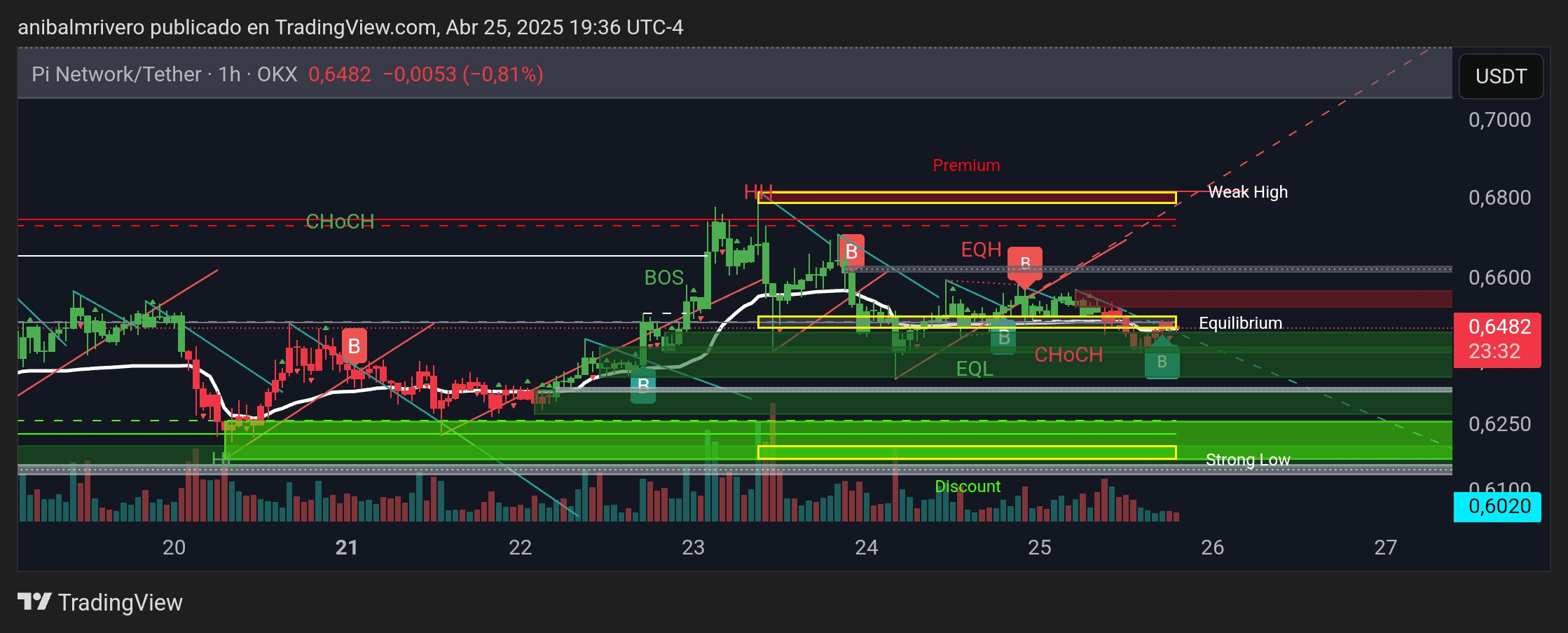 L'azione del prezzo di Pi Network rispetto a Tether (USDT) nel timeframe orario presenta un quadro complesso, caratterizzato da cambiamenti recenti nella struttura del mercato e livelli chiave di interesse. Dopo una notevole Rottura di Struttura (BOS) al rialzo intorno al 23 aprile, il prezzo ha raggiunto una zona Premium potenziale, trovando un Massimo Debole. Questo rifiuto ha portato a un Cambio di Carattere (CHOCH) al ribasso, il che indica un possibile cambiamento nell'impulso a breve termine.