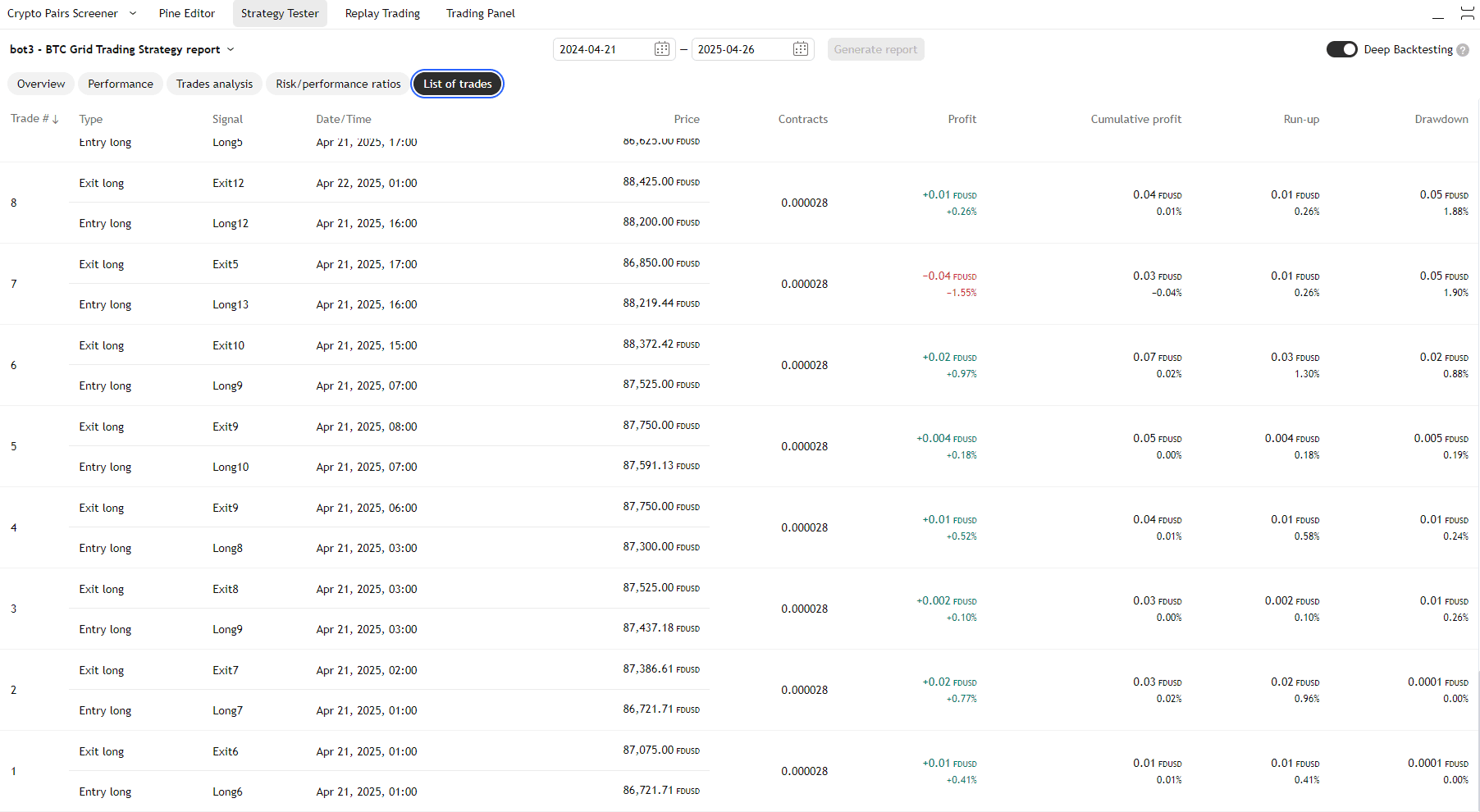 Ciao a tutti! Oggi ho deciso di scrivere il mio primo articolo dedicato allo studio della redditività dei #bot_trading s. Avevo una domanda: come si relaziona il reddito dal trading con un bot a griglia a una semplice posizione long? Cos'è un bot a griglia: il capitale viene automaticamente suddiviso per il numero di griglie, e al raggiungimento del prezzo appropriato, l'ordine del BOT viene attivato, sia short che long. Cos'è un ordine long: come sappiamo, è cresciuto continuamente, quasi fin dall'inizio, anche se ci sono stati fallimenti temporanei abbastanza frequenti nella sua storia di prezzo $BTC , ma in generale, una persona che avesse investito una somma minima 2-3 anni fa avrebbe potuto arricchirsi. Pertanto, ho deciso di controllare cosa sia più redditizio: un bot a griglia o acquistare un asset, in questo caso, $BTC , a un certo momento e venderlo dopo un po'. Per l'analisi, ho preso il trend rialzista dal 21 aprile 2025 al 26 aprile 2025. Ho utilizzato il programma TradingView, creato una strategia approssimativa per il bot, attraverso il Pin script con l'aiuto dell'IA, e ho ottenuto il risultato, ovviamente, non al primo tentativo. Ma diamo un'occhiata a questi risultati: La prima immagine è un grafico del comportamento del prezzo di $BTC/$FDUSD $FDUSD- stablecoins sull'exchange Binance. Vediamo un trend rialzista con una piccola correzione del prezzo. La prossima immagine è la scheda Analisi Strategia - uno strumento integrato in TradingView. Vediamo un profitto netto del +0,56 percento per il periodo. Questo significa che il nostro #bitcoin ot ha guadagnato circa mezzo punto percentuale dei fondi investiti in questi 5 giorni. Non male, ma diamo un'occhiata al periodo di rendimento buy&hold, dove vedremo quanto possiamo guadagnare se compriamo bts dall'inizio del periodo e lo vendiamo alla fine! Quasi il 9 percento!!! La differenza è enorme, e subito sorgono dubbi nei risultati, e in effetti, possiamo vedere nella Figura 3 che la mia strategia generata non copia completamente il bot a griglia di Binance - per esempio, vediamo solo posizioni long e non vediamo short. Ancora non so perché non funzioni... In secondo luogo, ovviamente, il $BTC grafico dei prezzi non ha solo trend rialzisti, ma questo influenzerà anche il risultato di questa competizione. Terzo, i parametri specifici del bot influenzano anche. Ma la logica suggerisce anche - è meglio comprare a basso prezzo una volta e poi vendere a prezzo alto! L'unica domanda è quando????