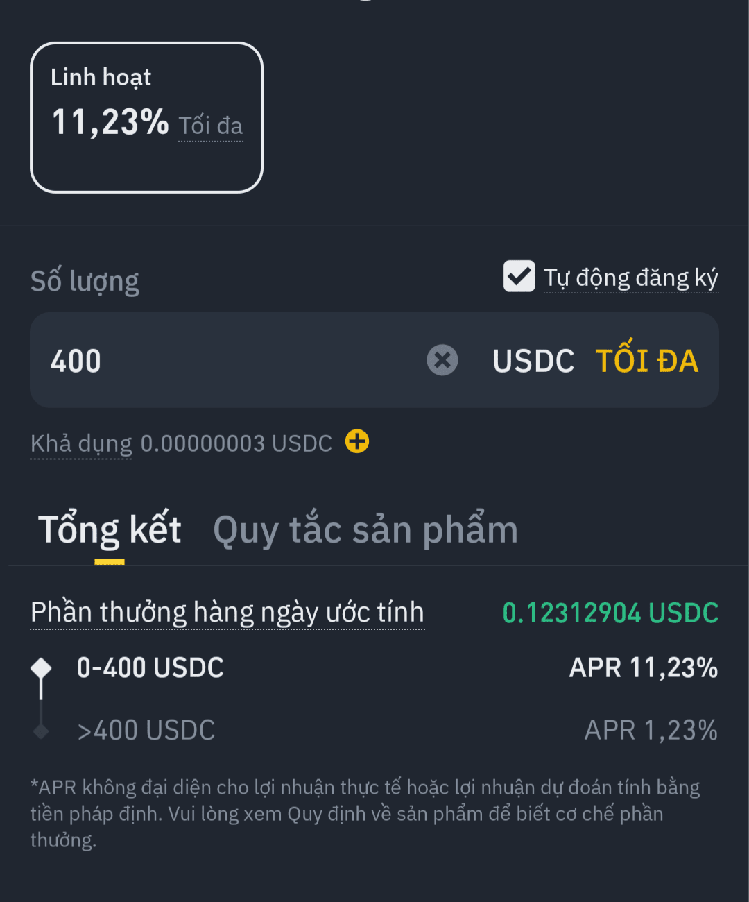 400 USD → USDC Flexible Earn (interesse 11.23%)