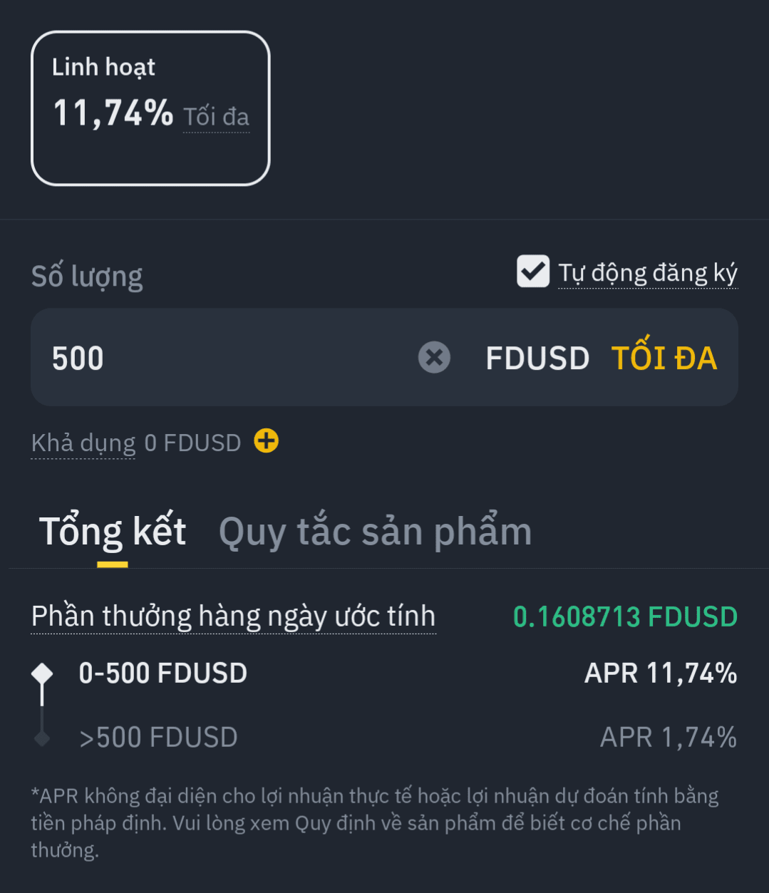 500 USD → FDUSD Flexible Earn (interesse 11.74%)