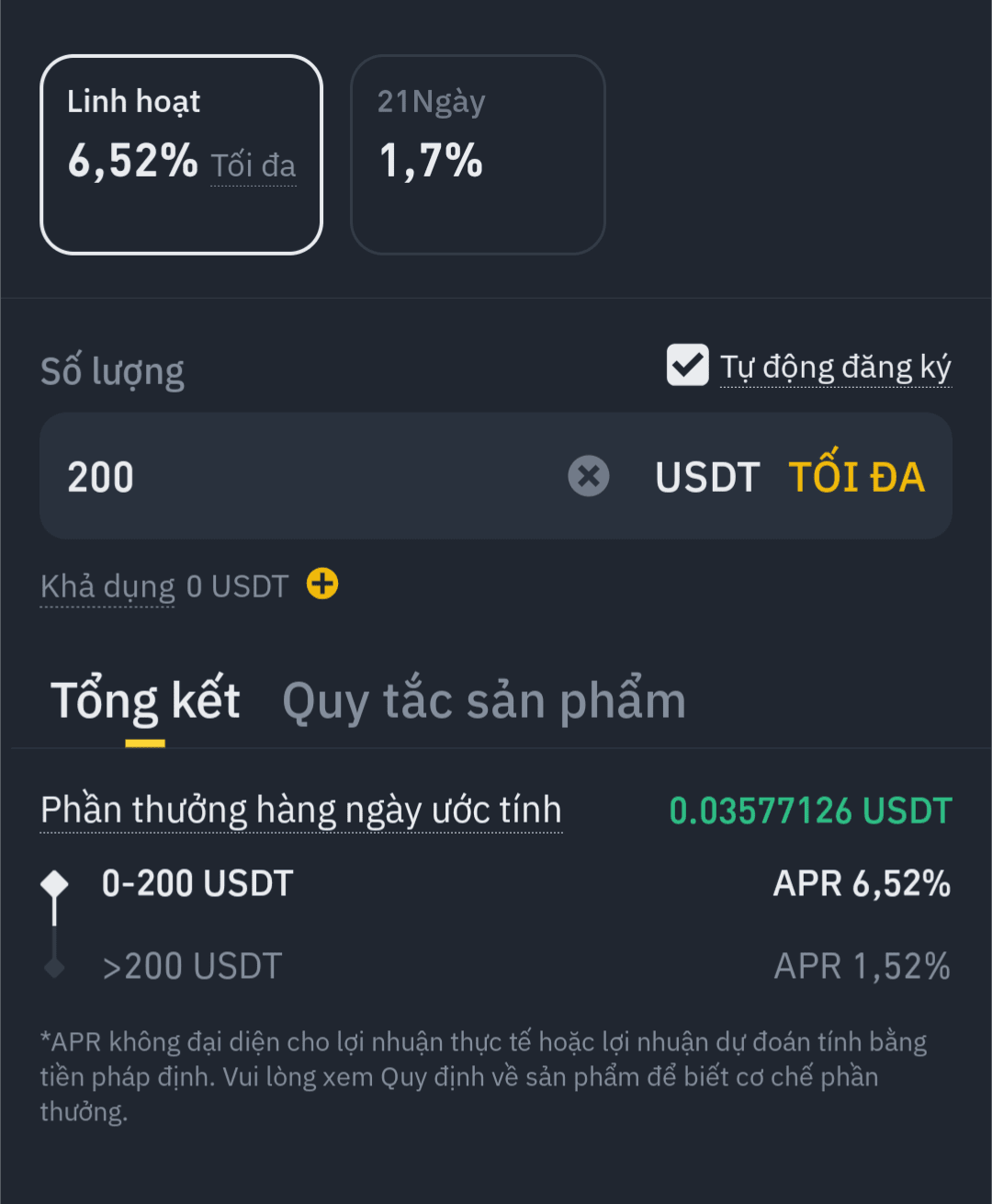 200 USD → USDT Flexible Earn (interesse 6.52%)