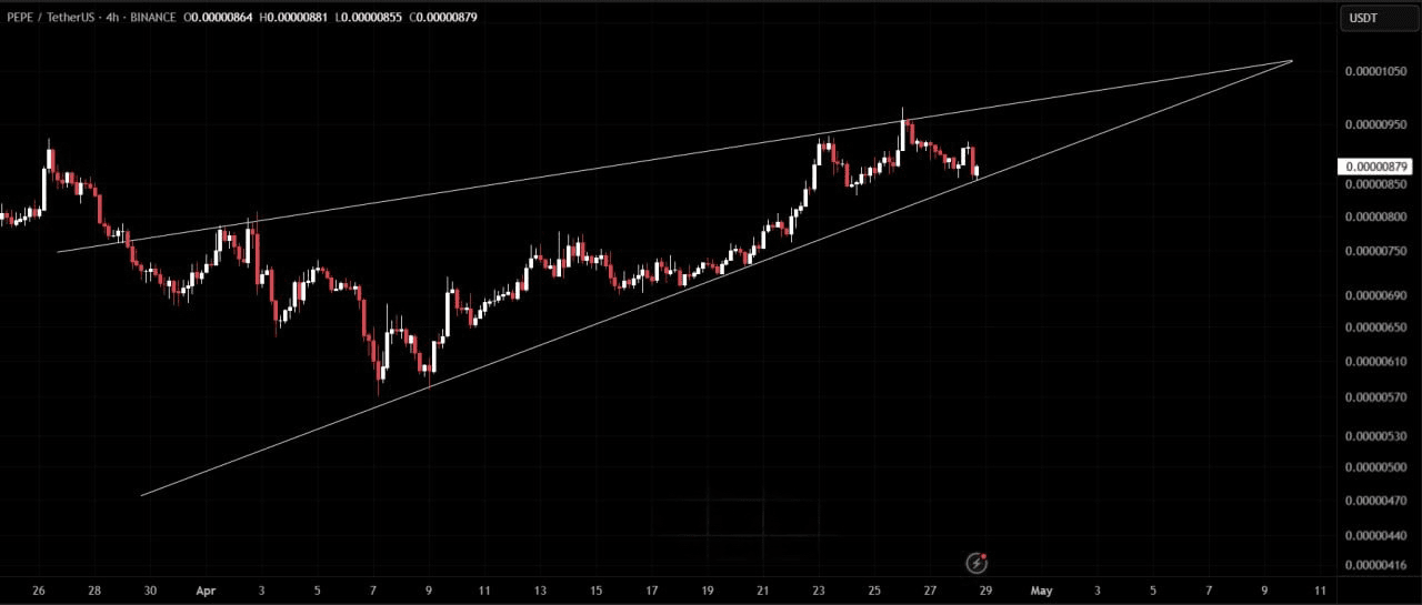 PEPE sta negoziando all'interno di un pattern a cuneo rialzista e attualmente sta rimbalzando dalla linea di supporto. Il prezzo sta riacquistando slancio dopo un periodo di debolezza. Se PEPE mantiene il suo attuale livello, potrebbe testare nuovamente la linea di resistenza o addirittura uscire dal pattern. Tuttavia, se si verifica una rottura, il prezzo potrebbe ulteriormente diminuire.