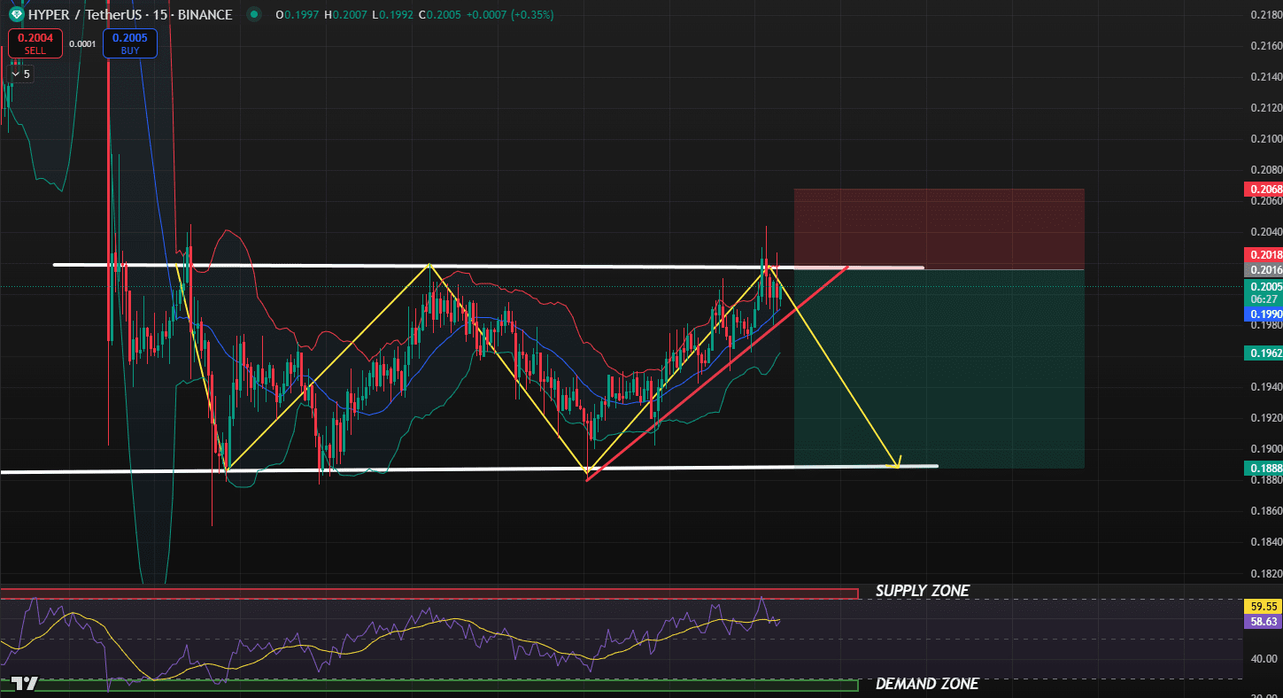 Nel grafico a 15 minuti, HYPER/USDT si sta consolidando all'interno di un canale mantenendosi sopra una linea di tendenza ascendente. Se HYPER scende sotto questa linea di tendenza e conferma il movimento con un retest pulito, potrebbe presentare un'opportunità di vendita. Inoltre, l'RSI si trova attualmente nella zona di offerta, il che supporta ulteriormente un bias ribassista.