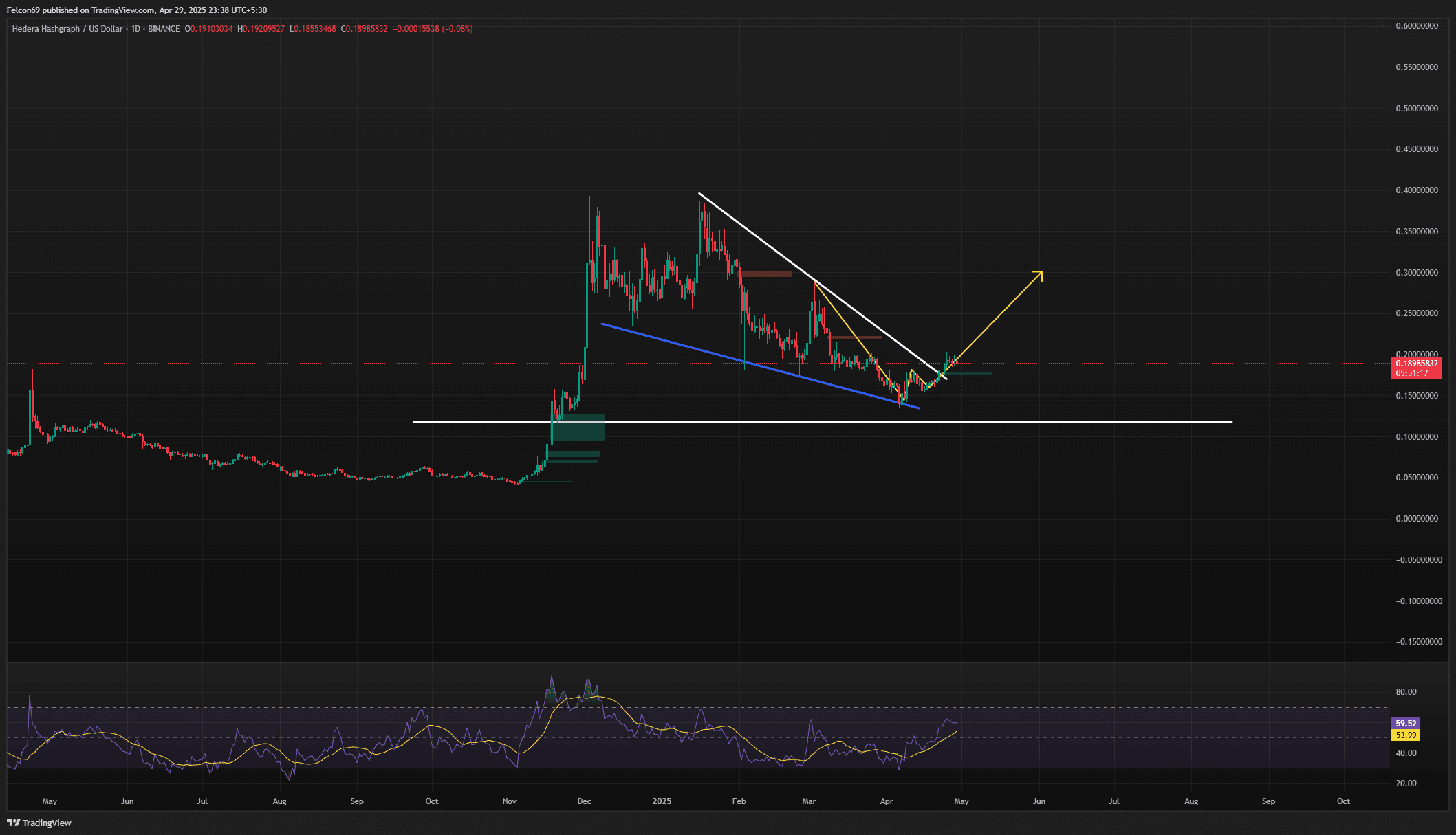 1) Posso vedere che questo è il grafico HBAR a 1 giorno. Il prezzo ha recentemente formato un triangolo discendente ed ora sta rompendo, suggerendo un potenziale inversione rialzista 📈. Il prezzo si sta anche avvicinando a un livello di supporto significativo vicino a 0.1500, che ha tenuto in passato 🔒. L'RSI è attualmente sopra 50, indicando un momento positivo. C'è una rottura rialzista in corso, e il prezzo potrebbe dirigersi verso l'intervallo 0.2500-0.3000 se la tendenza al rialzo continua 🚀.