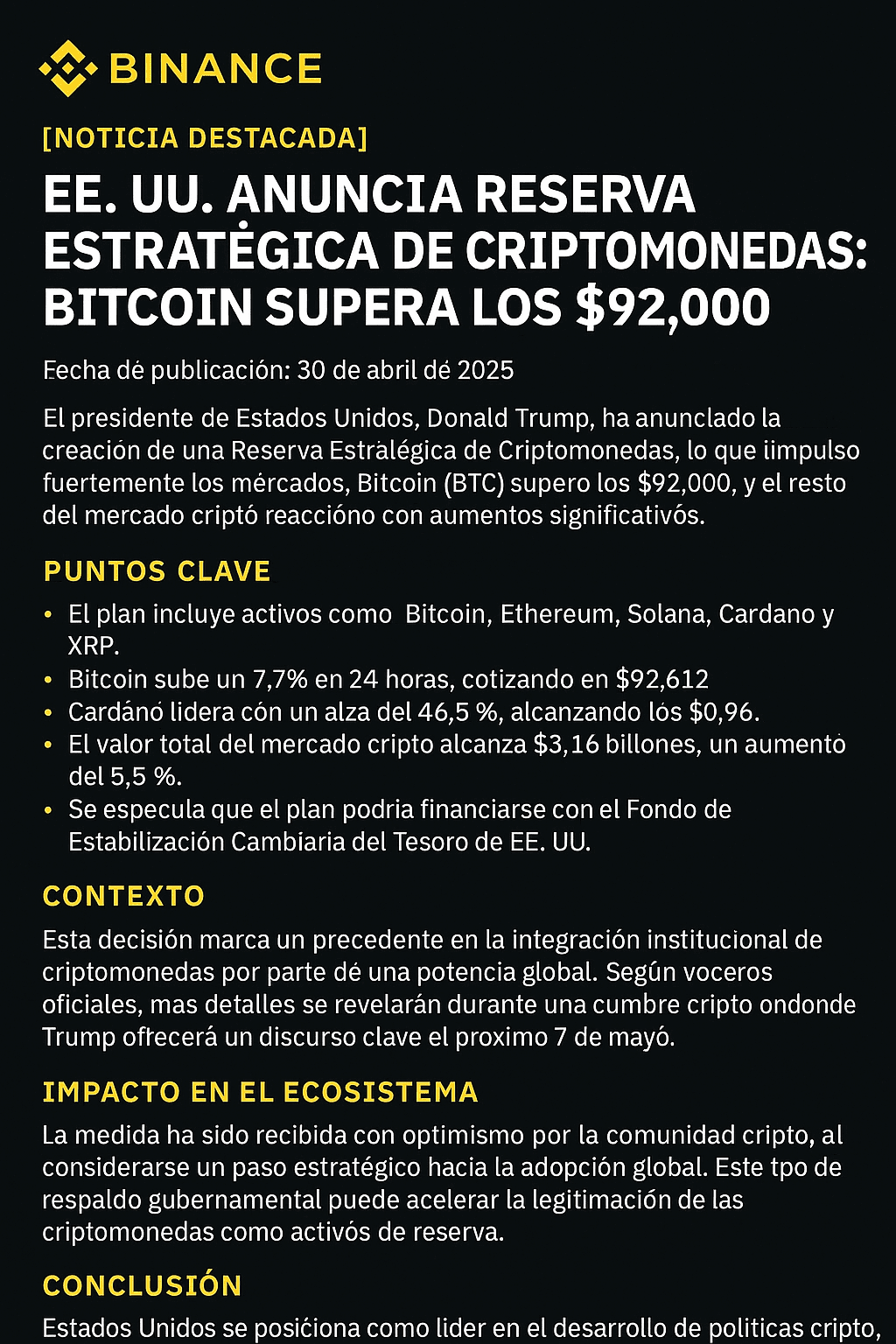 Questa decisione segna un precedente nell'integrazione istituzionale delle criptovalute da parte di una potenza globale. Secondo fonti ufficiali, ulteriori dettagli saranno rivelati durante un summit cripto in cui Trump terrà un discorso chiave il prossimo 7 maggio.