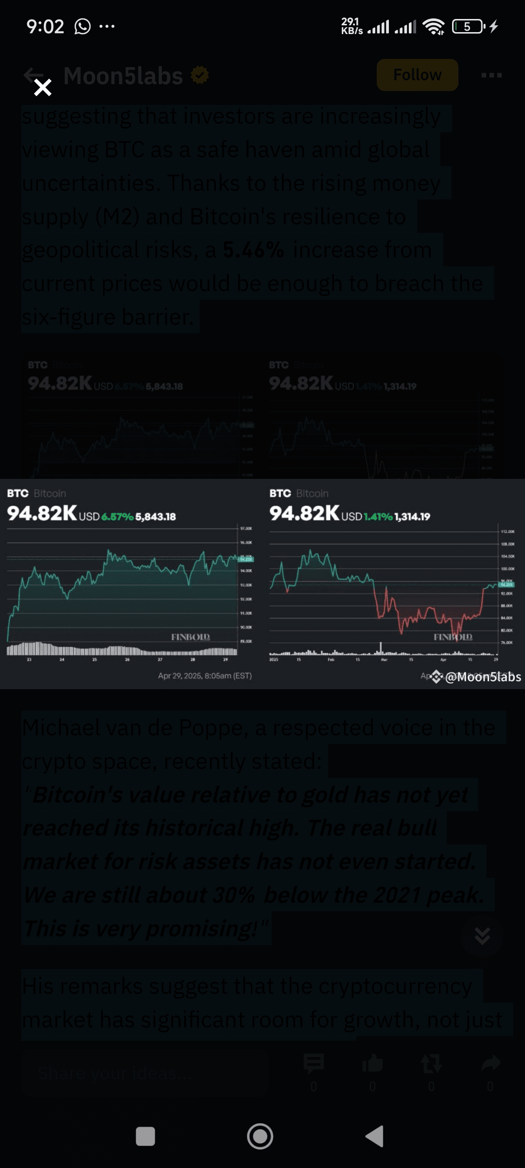 È interessante notare che i recenti movimenti di prezzo di Bitcoin si sono allontanati da quelli del mercato azionario. Invece, mostra schemi simili a quelli dell'oro, suggerendo che gli investitori stanno sempre più vedendo BTC come un rifugio sicuro in mezzo alle incertezze globali. Grazie all'aumento della massa monetaria (M2) e alla resilienza di Bitcoin ai rischi geopolitici, un aumento del 5,46% dai prezzi attuali sarebbe sufficiente per superare la barriera delle sei cifre.