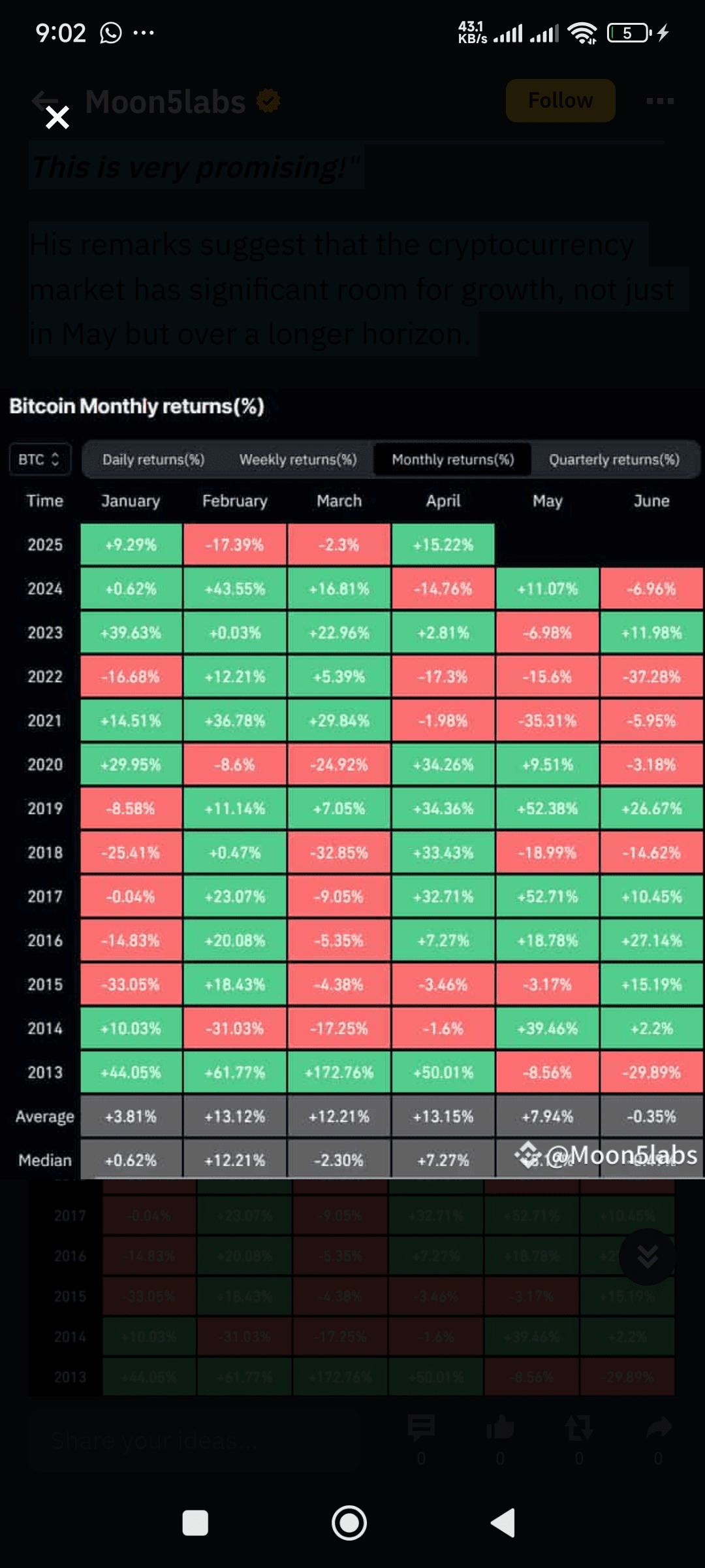 Secondo i dati della piattaforma di analisi di mercato CoinGlass, Bitcoin ha storicamente registrato un rendimento medio del 7,94% durante maggio dal 2013. Se questa tendenza continua, Bitcoin potrebbe raggiungere circa $102,273! 📈