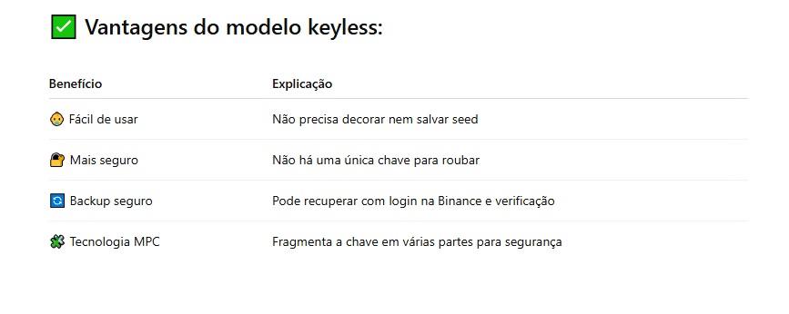 “Keyless” significa senza chiave privata visibile o archiviata localmente da te.