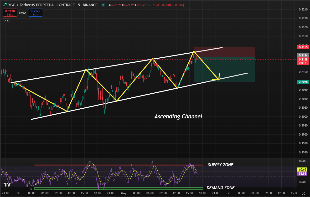 YGG attualmente è scambiato all'interno di un canale ascendente sul timeframe di 5 minuti. Recentemente ha testato la linea di tendenza superiore e prevedo un movimento verso la linea di tendenza inferiore successivamente. Inoltre, l'RSI è vicino alla zona di offerta e probabilmente retraccerà verso la zona di domanda.