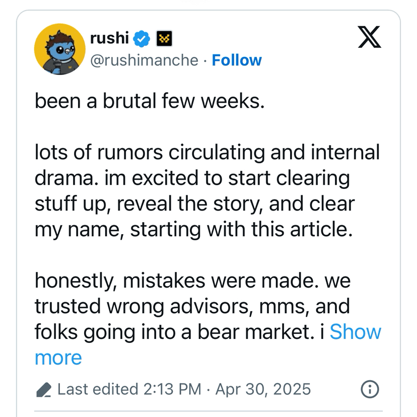 Movement $MOVE conferma che Rushi Manche è stato sospeso da Movement Labs. Questa decisione è stata presa alla luce degli eventi in corso e poiché la revisione da parte di terzi è ancora in corso da parte di Groom Lake riguardo alla governance organizzativa e recenti incidenti che coinvolgono un market maker.
