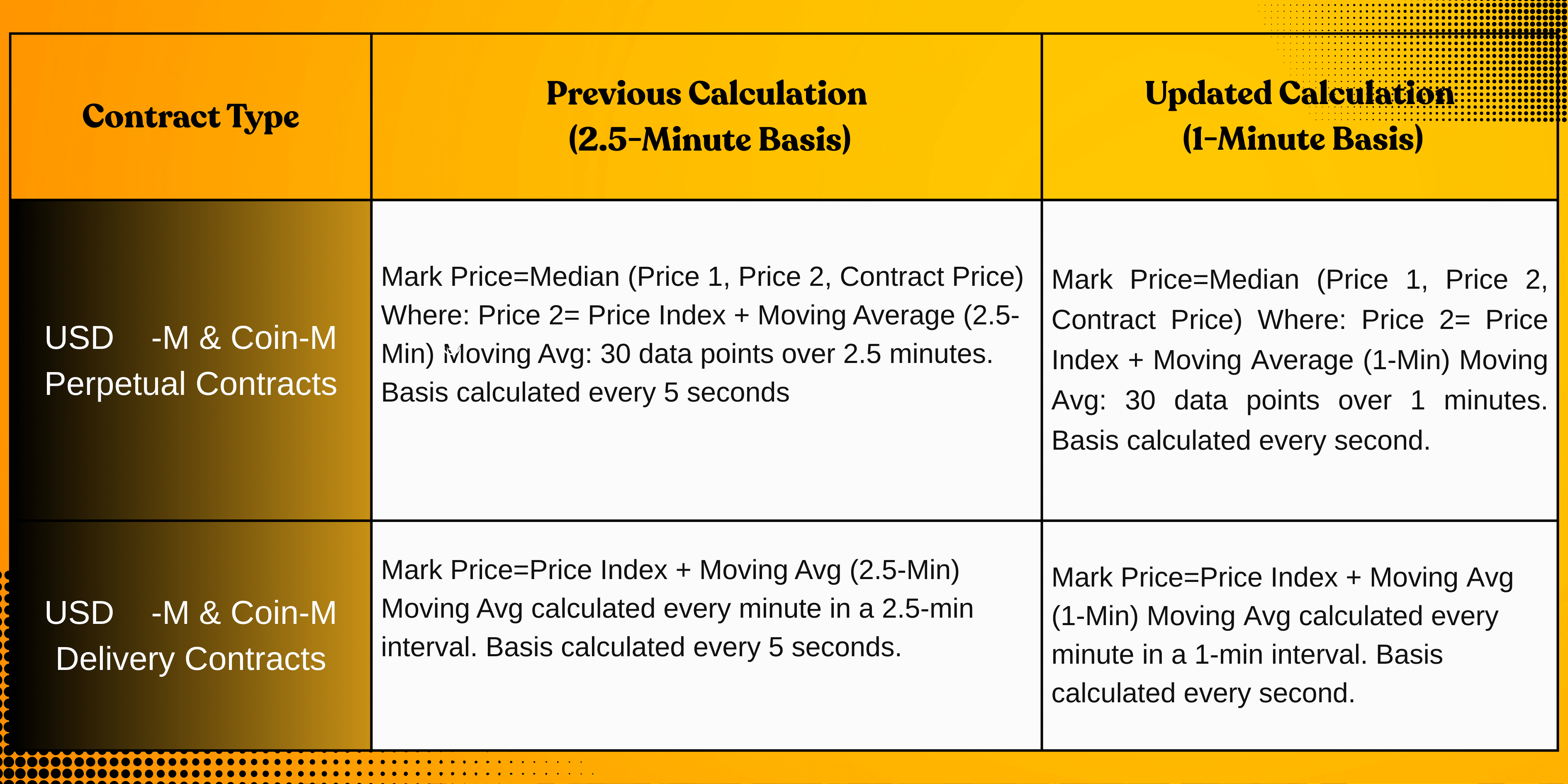 A partire dal 2025-05-05, Binance Futures passerà dalla base di "Prezzo 2" utilizzata nelle formule del prezzo di riferimento a una media mobile di 1 minuto invece di una media mobile di 2,5 minuti. Questo miglioramento sarà applicato a tutti i contratti perpetui e di consegna.