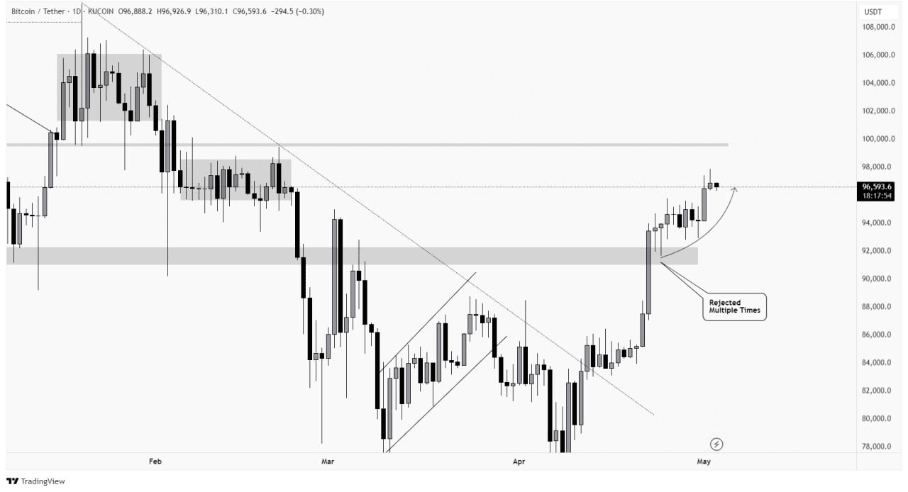 Bitcoin ha mostrato una forza significativa sul Timeframe Giornaliero, facendo finalmente un movimento decisivo sopra il livello chiave di $95.000 dopo una rottura e un ritest riusciti. Questo segna una pietra miliare importante, ma ora tutti gli occhi sono puntati sul Timeframe Settimanale per vedere se il prezzo può chiudere sopra questa resistenza cruciale.