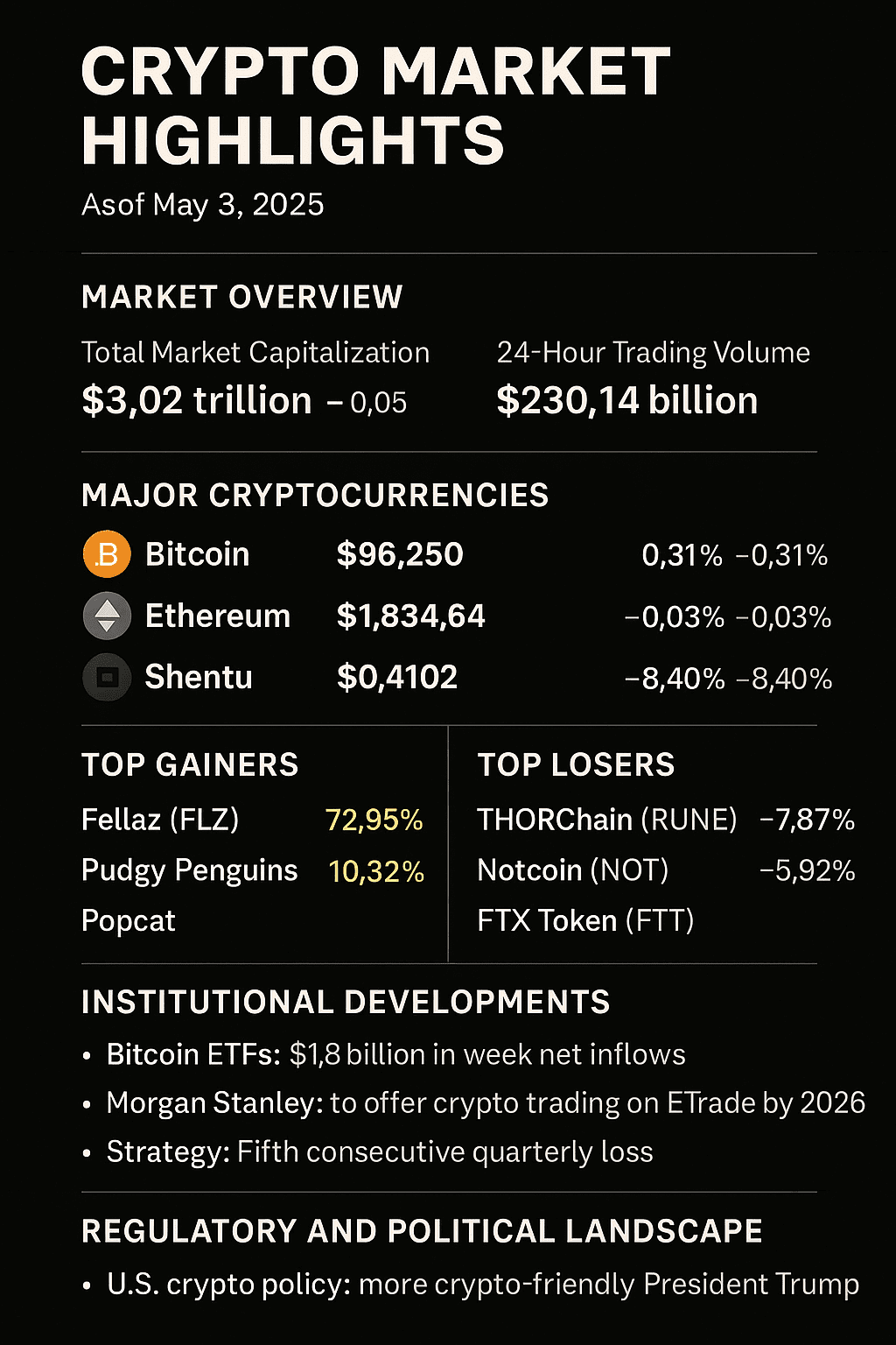 A partire dal 3 maggio 2025, il mercato delle criptovalute mostra una combinazione di momentum rialzista e consolidamento cauto. Ecco una panoramica dettagliata dei punti salienti attuali del mercato: