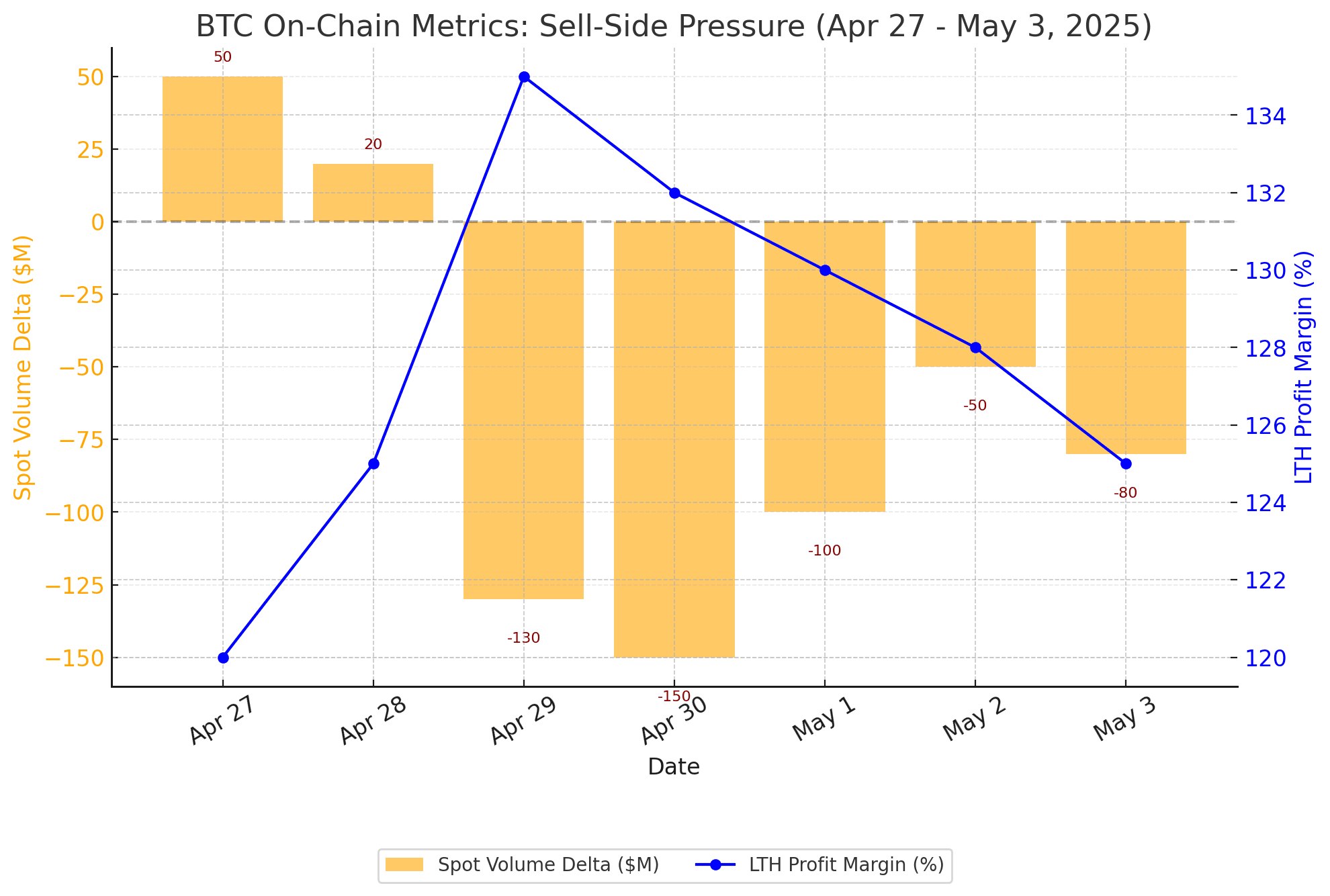 Delta Volume Spot: Tra il 27 e il 29 aprile, il delta volume spot è diventato bruscamente negativo (-$193,4M il 29 aprile), indicando vendite aggressive e una domanda spot in indebolimento. Questo suggerisce presa di profitto o esaurimento degli acquirenti, precursori comuni delle correzioni.