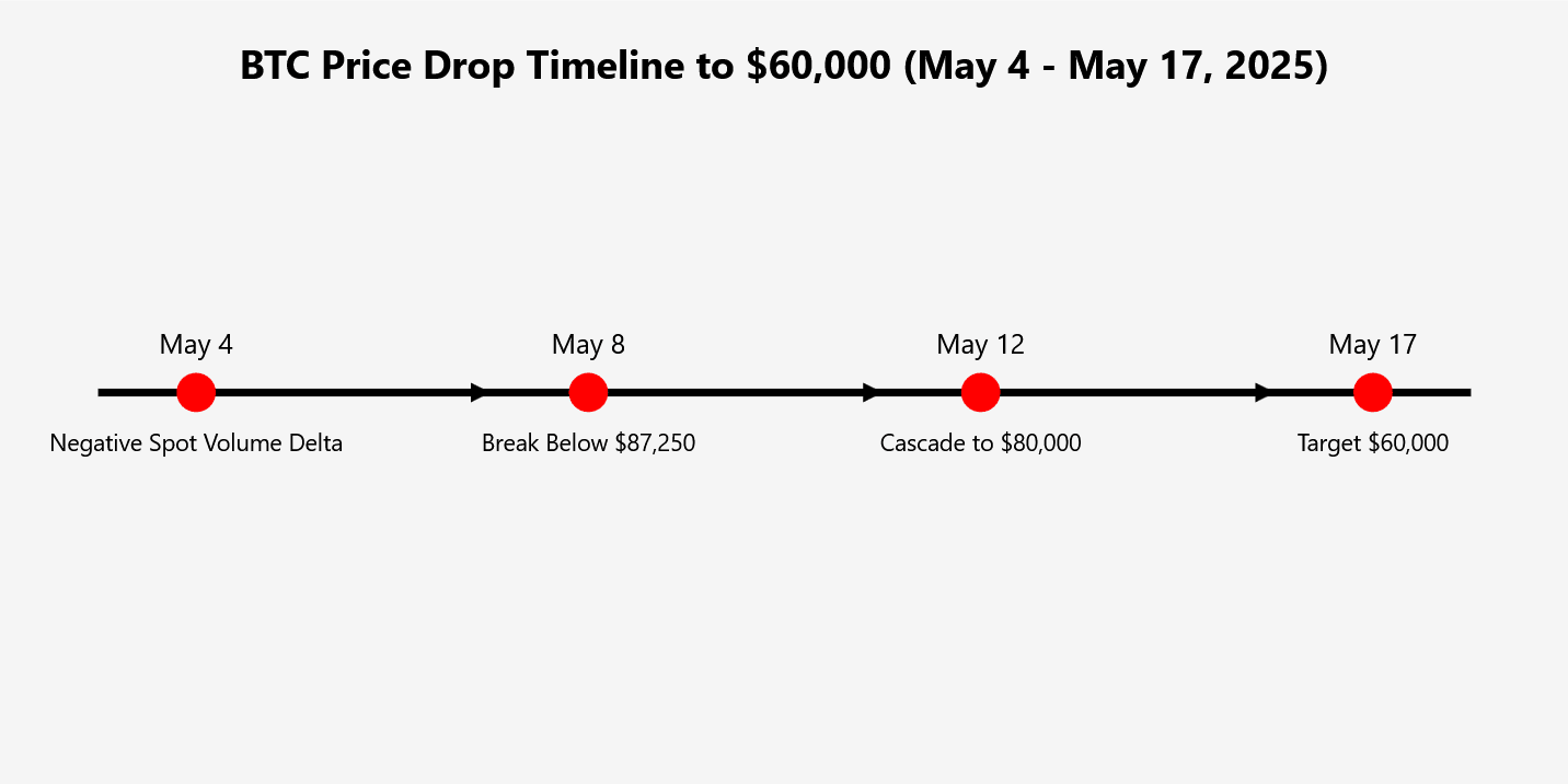 Settimana 2 (11–17 maggio): Il fallimento nel riconquistare $87.250 conferma il trend ribassista. Il wedge ascendente macro si rompe, mirando a $65.000–$69.000. Le liquidazioni a cascata e i trigger di stop-loss superano $60.000, un livello con supporto storico dall'inizio del 2024.