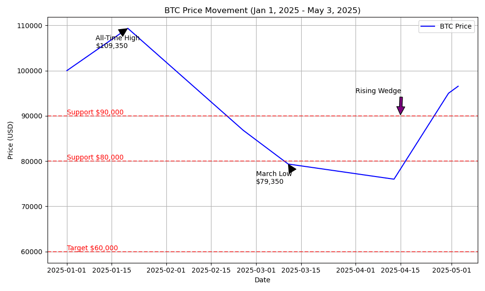Al 3 maggio 2025, Bitcoin (BTC) viene scambiato a $96.318,33, vicino al suo massimo storico di $109.464,94 stabilito a gennaio. Nonostante un rally rialzista alimentato dall'adozione istituzionale e dai flussi ETF, la crescente pressione di vendita, i segnali di allerta tecnici e le incertezze macroeconomiche indicano una forte correzione. Questo post delinea perché BTC potrebbe cadere a $60.000 entro le prossime due settimane, entro il 17 maggio 2025.
