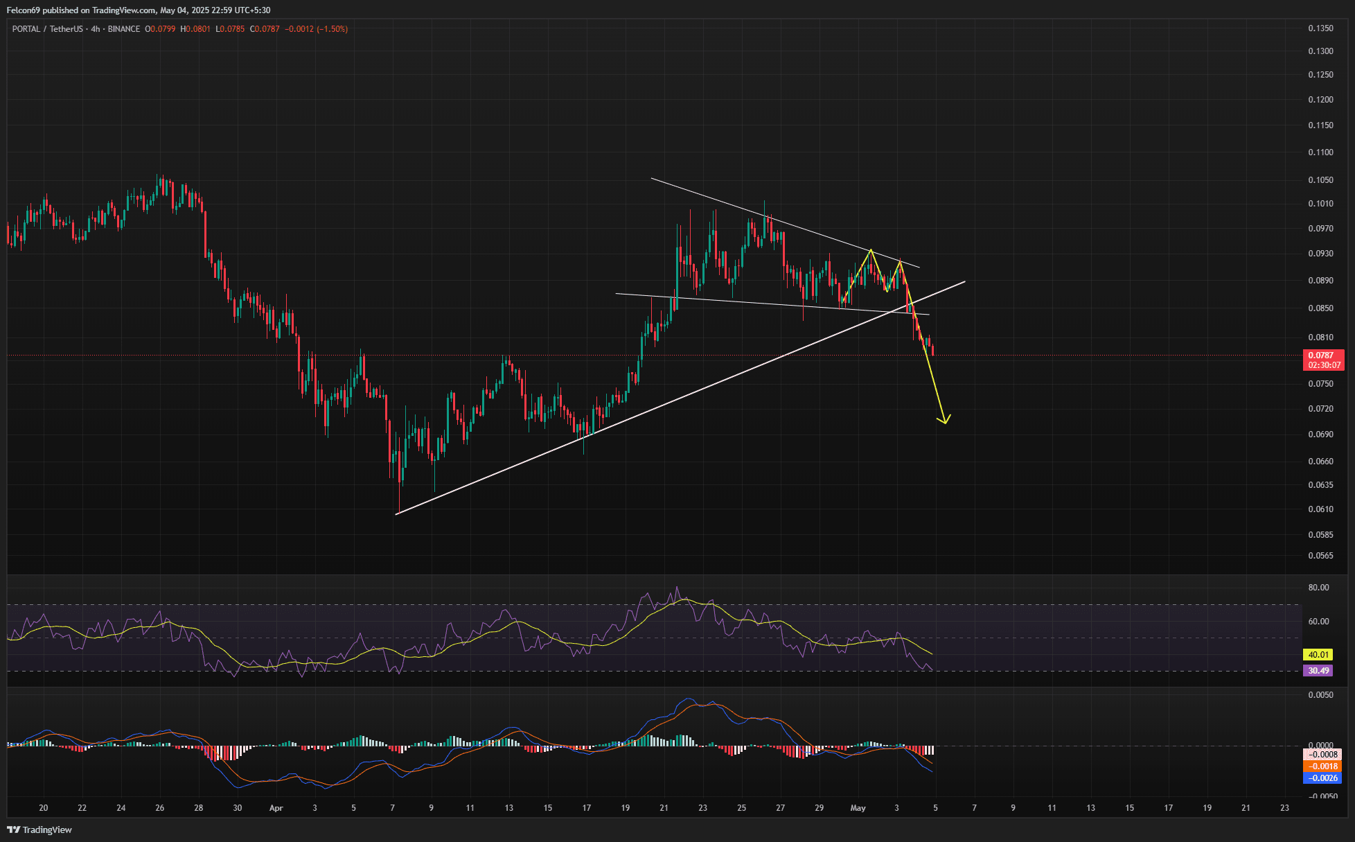 1) Questo grafico mostra PORTAL/USDT sul timeframe di 4 ore e sta mostrando un modello a cuneo ascendente, che è un modello grafico ribassista. L'RSI mostra un momento neutro, ma un'inversione verso il basso è probabile data l'attuale configurazione e le condizioni di mercato.