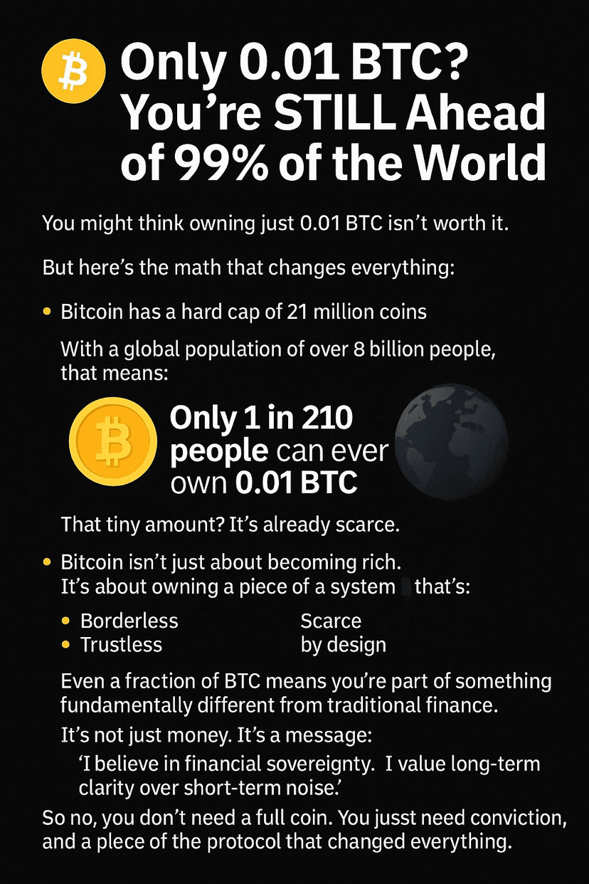 Con oltre 8 miliardi di persone nel mondo, ciò significa che solo 1 persona su 210 potrebbe mai possedere 0.01 $BTC .
