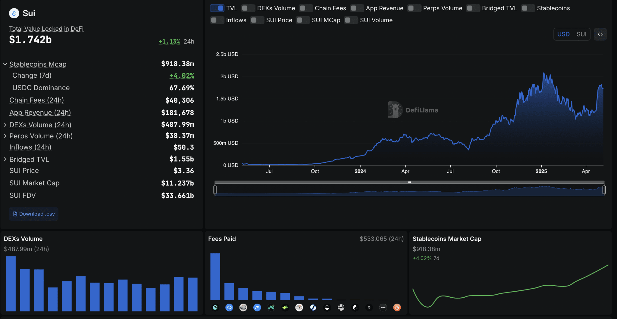 Inoltre, i dati di DeFiLlama mostrano che la capitalizzazione di mercato della stablecoin SUI è salita a 918 milioni di dollari, un nuovo massimo storico. A partire dal 6 maggio, il volume giornaliero DEX sulla rete SUI ha raggiunto 487,99 milioni di dollari.