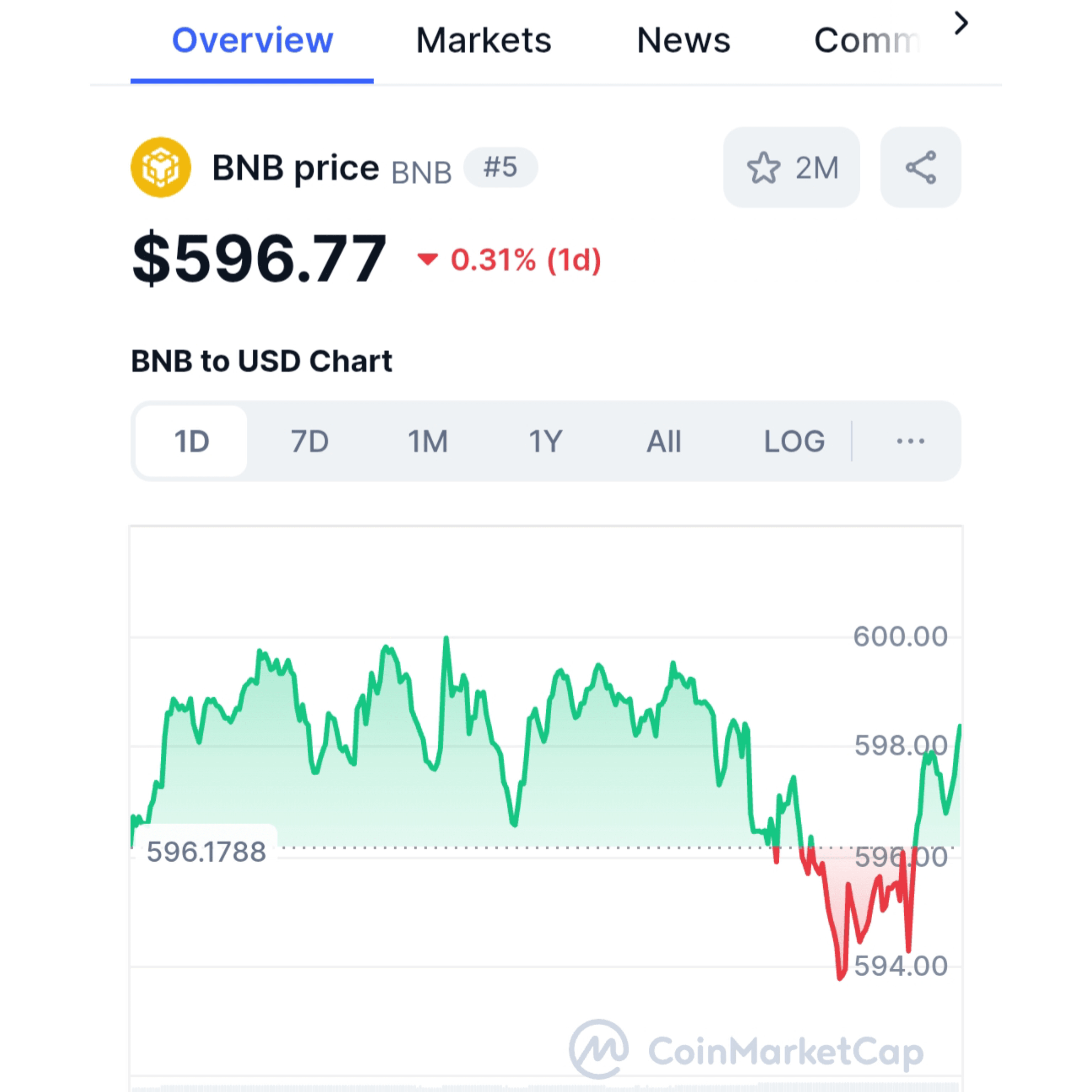 A partire dal 6 maggio 2025, Binance Coin (BNB), la criptovaluta nativa dell'ecosistema Binance, viene scambiata a circa $596.78 USD. Questo riflette una leggera diminuzione dello 0,3% nelle ultime 24 ore, con fluttuazioni intraday comprese tra $593.48 e $599.69. TradingView