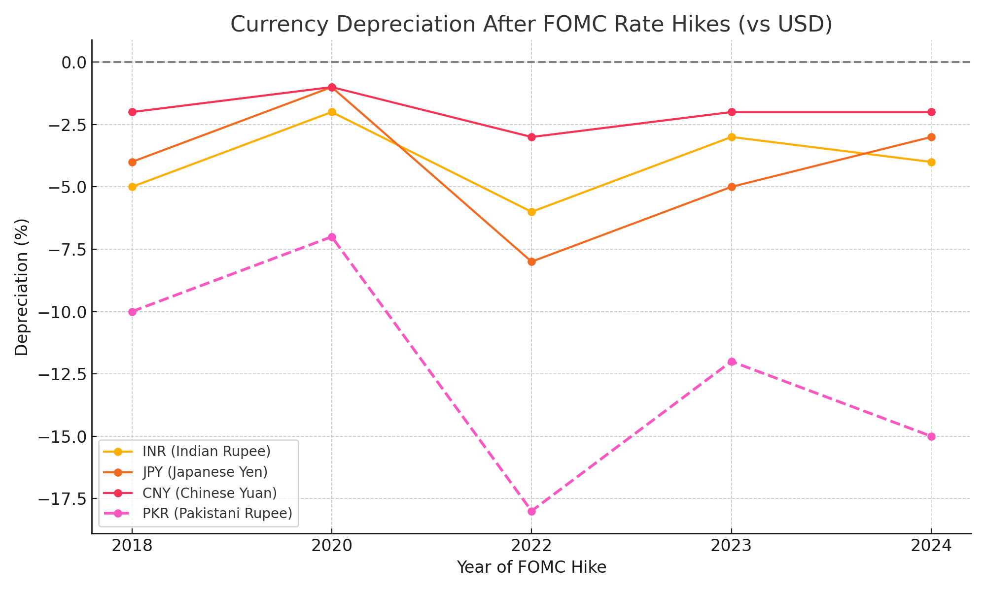 Una Fed aggressiva (aumento dei tassi) di solito rafforza il dollaro statunitense, causando la svalutazione di valute asiatiche come lo yen giapponese, la rupia indiana e il yuan cinese. Sebbene una valuta più debole possa stimolare le esportazioni rendendo i beni più economici per gli acquirenti stranieri, aumenta anche il costo delle importazioni denominate in dollari, come il petrolio e i macchinari. I paesi fortemente dipendenti dalle importazioni, come l'India e l'Indonesia, potrebbero affrontare pressioni inflazionistiche.