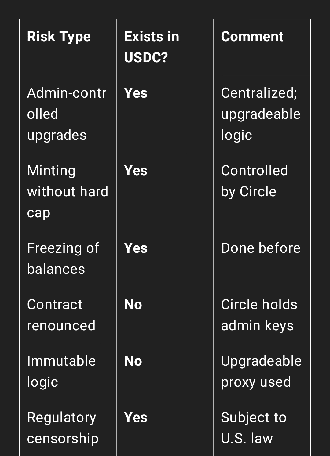 Rischio Reale: L'amministratore potrebbe, in teoria, introdurre un meccanismo di rug-pull o bug durante un aggiornamento. Tuttavia, Circle è un'entità regolamentata, quindi questo rischio riguarda più il controllo centralizzato che l'incompetenza tecnica o l'intento malevolo.