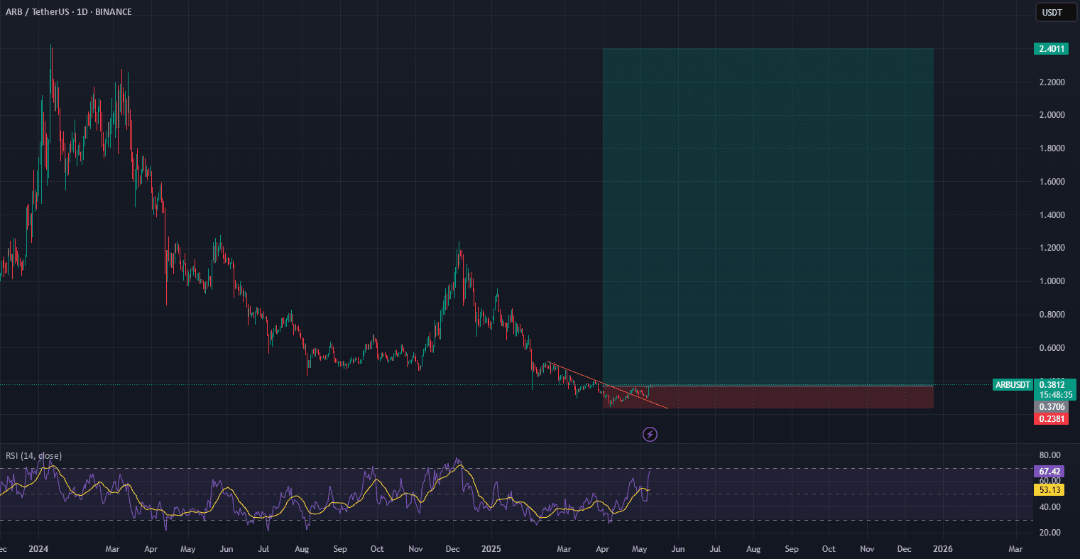ARB (Arbitrum) sta finalmente mostrando segni di vita. Dopo essere stato soppresso sotto una trendline discendente a lungo termine, abbiamo avuto una rottura confermata sul grafico giornaliero — e questo è il segnale che stavamo aspettando.