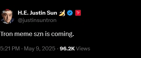 Il 19 marzo 2025, ha pubblicato: “Tron Meme szn 2.0 CONFERMATO. Completamente carico!”. Il tentativo ha visto un picco di attività, con 112 nuovi token lanciati in un solo giorno sulla piattaforma SunPump, che è un launchpad di memecoin costruito sulla blockchain TRON.