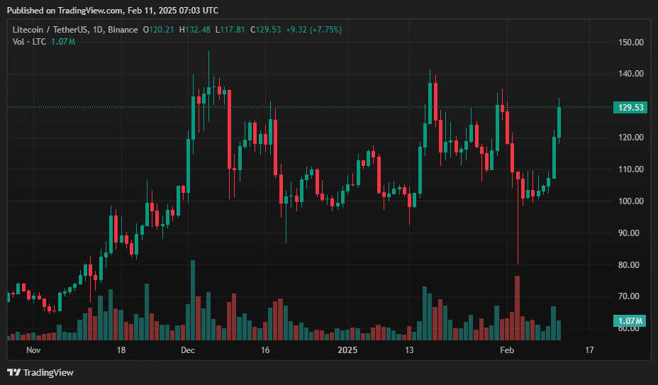A partire dall'11 febbraio 2025, LTC è scambiato a circa $129,49 per token. La criptovaluta ha registrato un massimo intragiornaliero di $131,32 e un minimo di $113,32. Il volume degli scambi nelle 24 ore è di $1,88 miliardi, contribuendo a una capitalizzazione di mercato di circa $9,77 miliardi.