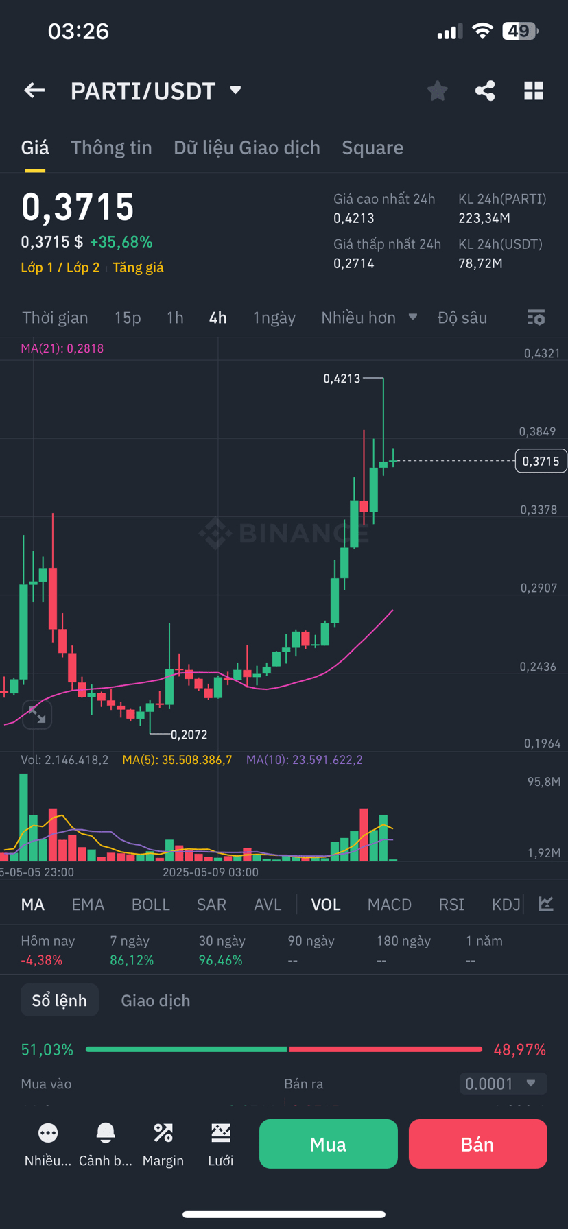 ➤ 26,2M PARTI scambiati in 24h (\~5,9M USDT) – segnale chiaro di balene e grandi flussi di capitale partecipare al pump.